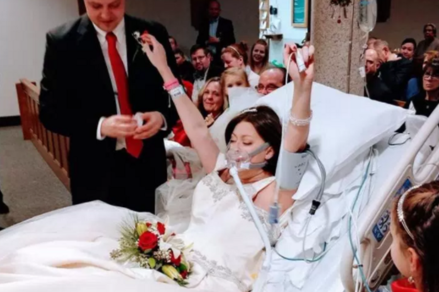 A mulher, que estava a ser tratada na unidade onde o casamento ocorreu, sofria de cancro na mama e deu o nó vestida de noiva e deitada na cama com uma máscara de oxigénio a cobrir-lhe a cara.