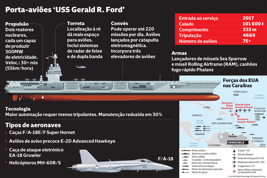 O Pentágono confirmou que o grupo naval do ‘USS Gerald R. Ford’, que inclui ‘destroyers’, fragatas lança-mísseis e outros navios de apoio, entrou terça-feira na zona de responsabilidade do Comando Sul dos EUA, que inclui a região da América Latina e Caraíbas. “Esta força naval vai reforçar a capacidade dos EUA de detetar, monitorizar e neutralizar atores ilícitos que comprometem a segurança e a prosperidade dos EUA” e ajudar a “combater o tráfico de estupefacientes e os grupos criminosos que operam na região”, afirmou um porta-voz.