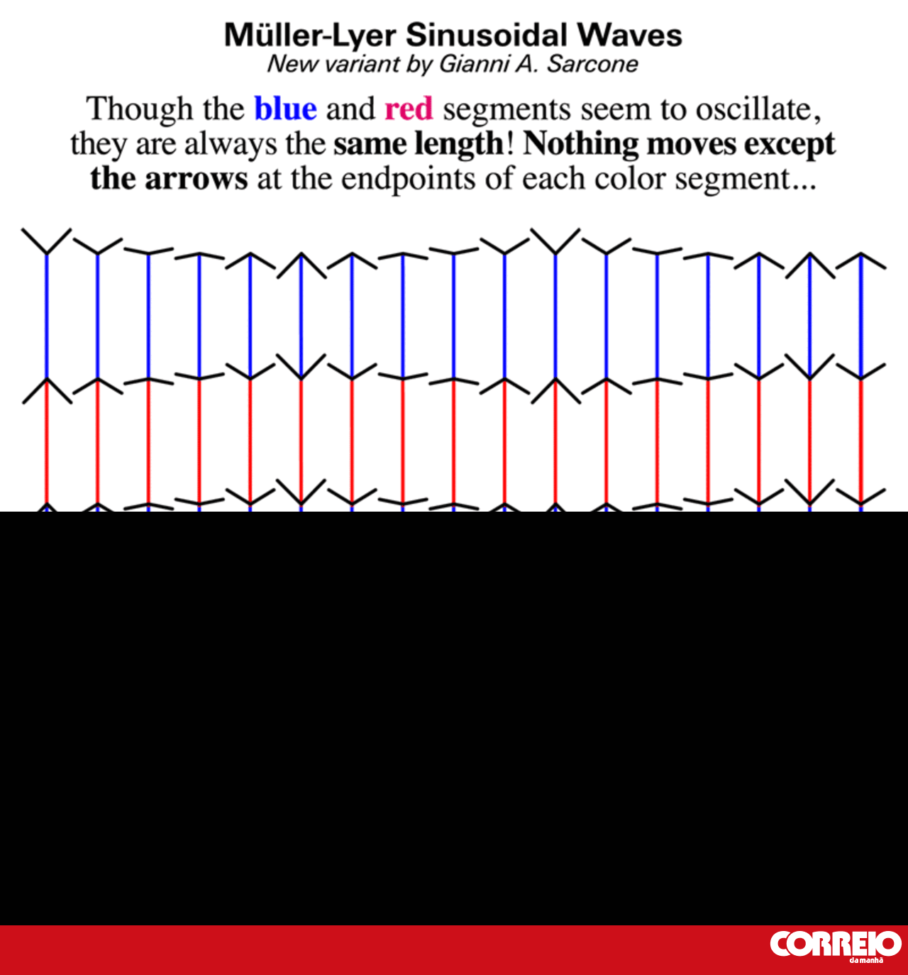 Gianni A. Sarcone é um artista italiano de 57 anos que se dedica à criação de ilusões de ótica, muitas delas influenciadas por trabalhos criados em 1889 pelo psicólogo alemão Franz Carl Müller-Lyer. O gif - formato de imagem que se move - partilhado mostra inúmeros segmentos de reta rosas e azuis que aparentam movimentar-se de forma coordenada simulando ondas, porém, contrariamente ao que aparentam, as linhas mantêm sempre com o mesmo comprimento. O psicólogo Chris Said explicou ao El País que o que realmente se move nesta ilusão são as setas cinzentas que separam as cores dos segmentos de reta. I'm biased here, but this is one of the strongest visual illusions I have ever seen.None of the colored lines are moving. pic.twitter.com/QcW3u6WFB4— Chris Said (@Chris_Said) January 3, 2020 Estas setas mudam constantemente os seus ângulos enquanto oslicam em torno do vértice criando a ideia de que o tamanho das linhas diverge conforme o posicionamento das retas cinzentas. Estas setas, quando atingem os 180º, criam a ideia de que todos os segmentos de reta padecem do mesmo tamanho. Esta não é a única criação influenciada pelo trabalho de Franz Carl Müller-Lyer, na realidade o artista visual publica com regularidade diversas ilusões no seu blog pessoal que remetem para esta teoria.Além de se dedicar à criação de ilusões, Gianni A. Sarcone, já editou algumas obras que estão relacionadas com esta arte e já participou, também, num concurso de ilusão de ótica no qual foi finalista em 2017.