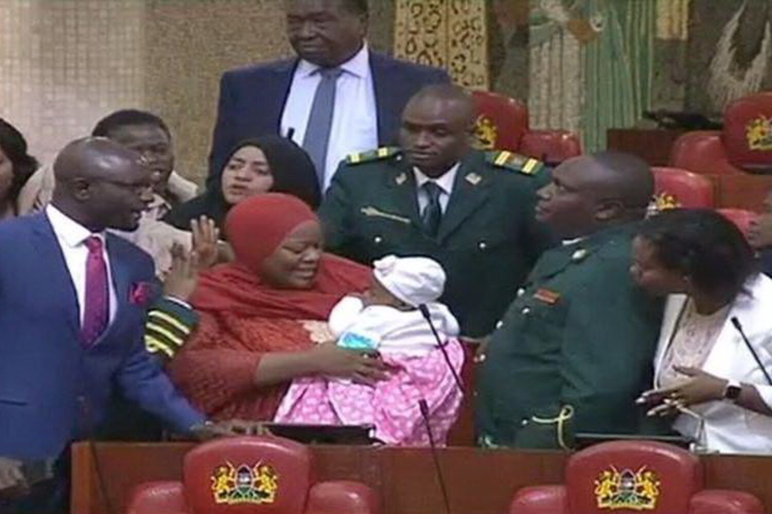 Um vídeo publicado no Twitter pela Citizen TV, mostra como um porta-voz da assembleia pediu à deputada para sair da sala depois de se ouvir o bebé da mesma a balbuciar por breves instantes.