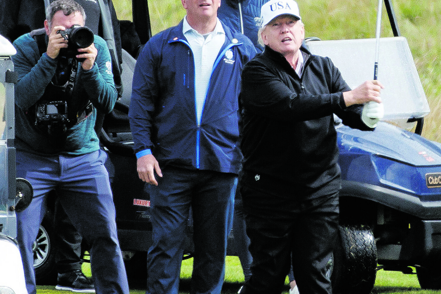 No sábado, o presidente dos EUA aproveitou a viagem para inaugurar um campo de golfe no seu resort na Escócia (é adepto do desporto e tem outro campo no seu resort na Florida, entre outros), enquanto centenas de escoceses saíram à rua para se manifestarem contra a sua visita, em protesto contra o acordo comercial celebrado recentemente entre os norte-americanos e o Reino Unido.
