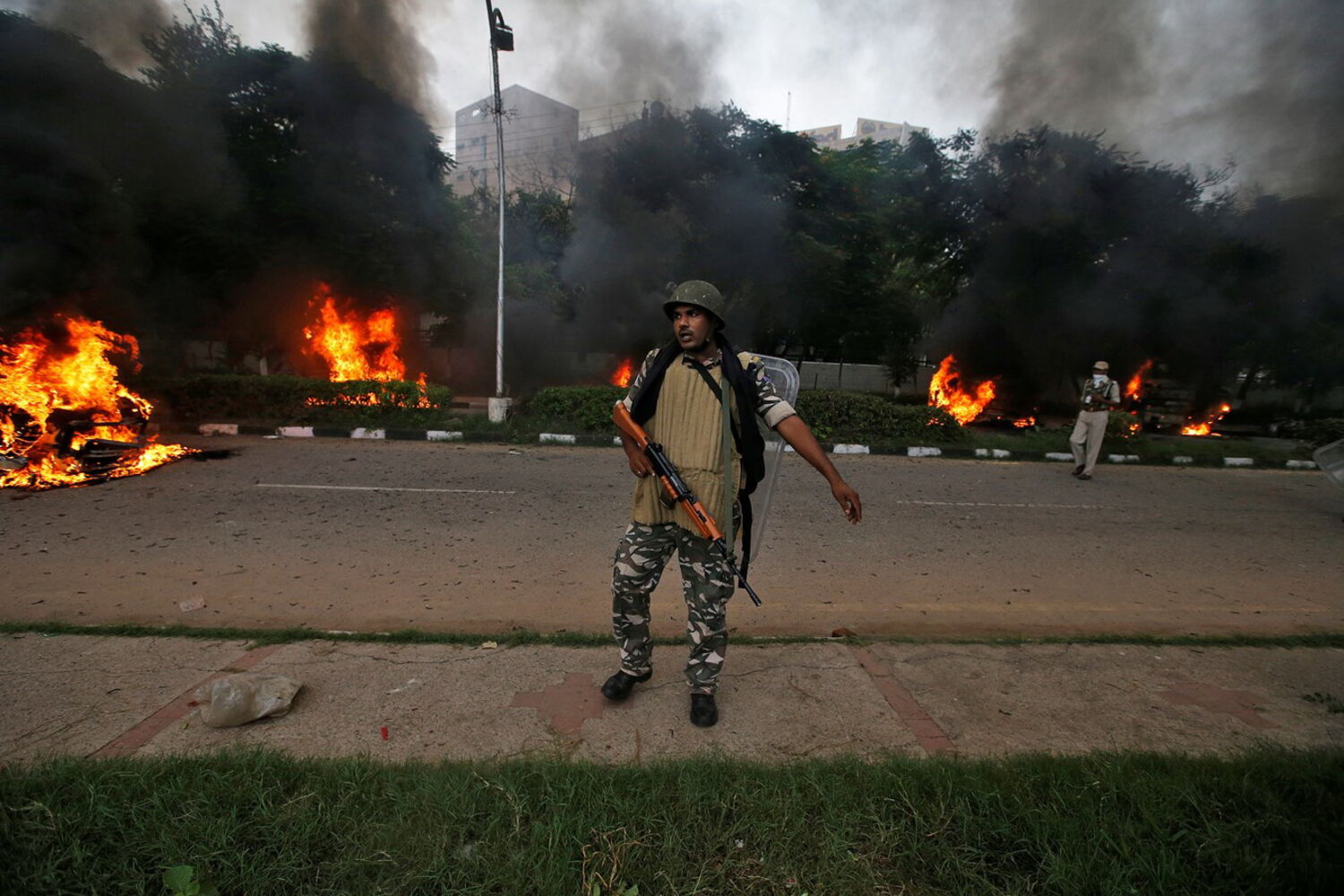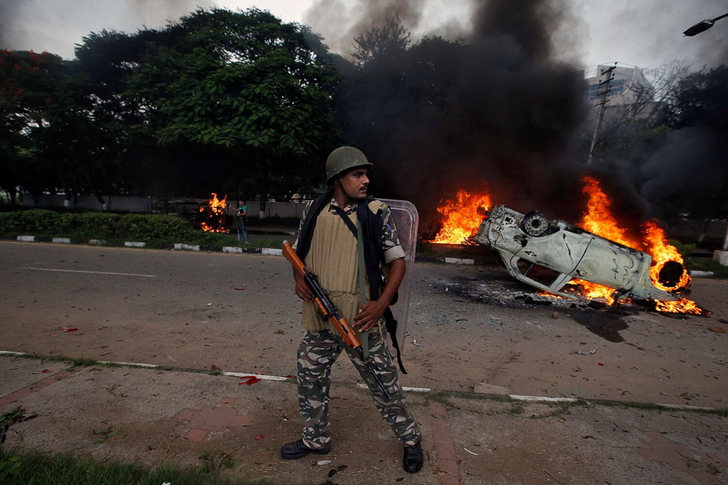 A multidão incendiou edifícios governamentais e atacou a polícia e jornalistas, danificando carrinhas de televisões e equipamento de transmissão, na cidade de Panchkula, no Estado de Haryana.