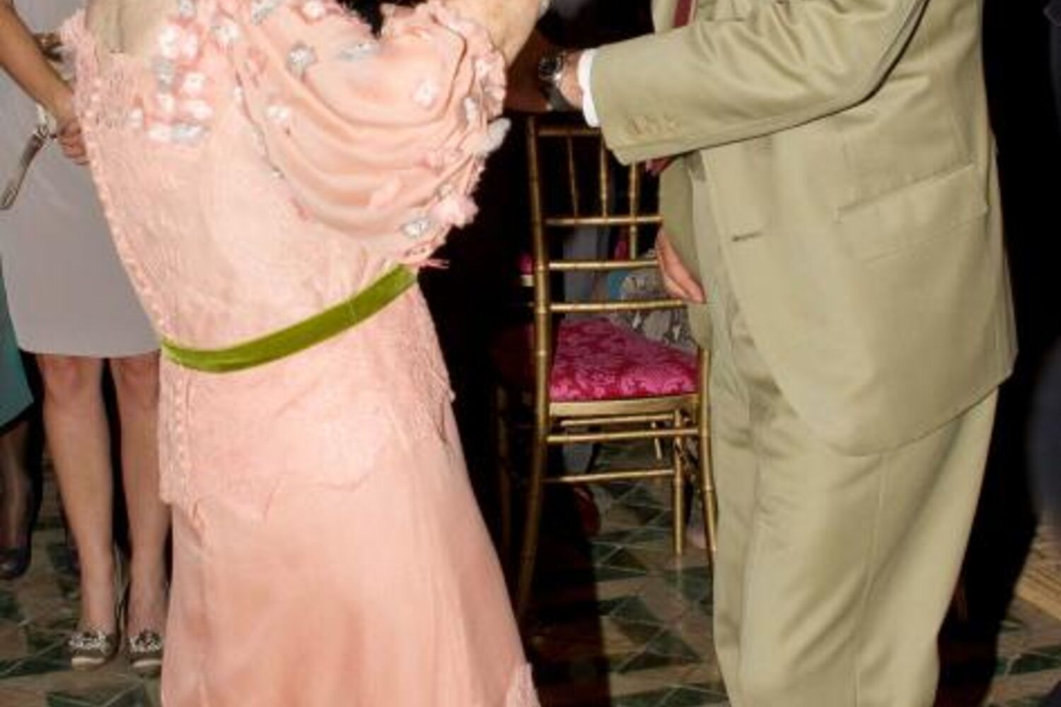 A noiva levou um vestido cor de salmão, com uma fina faixa em tons esverdeados em torno da cintura, da autoria dos designers Victorio & Lucchino.