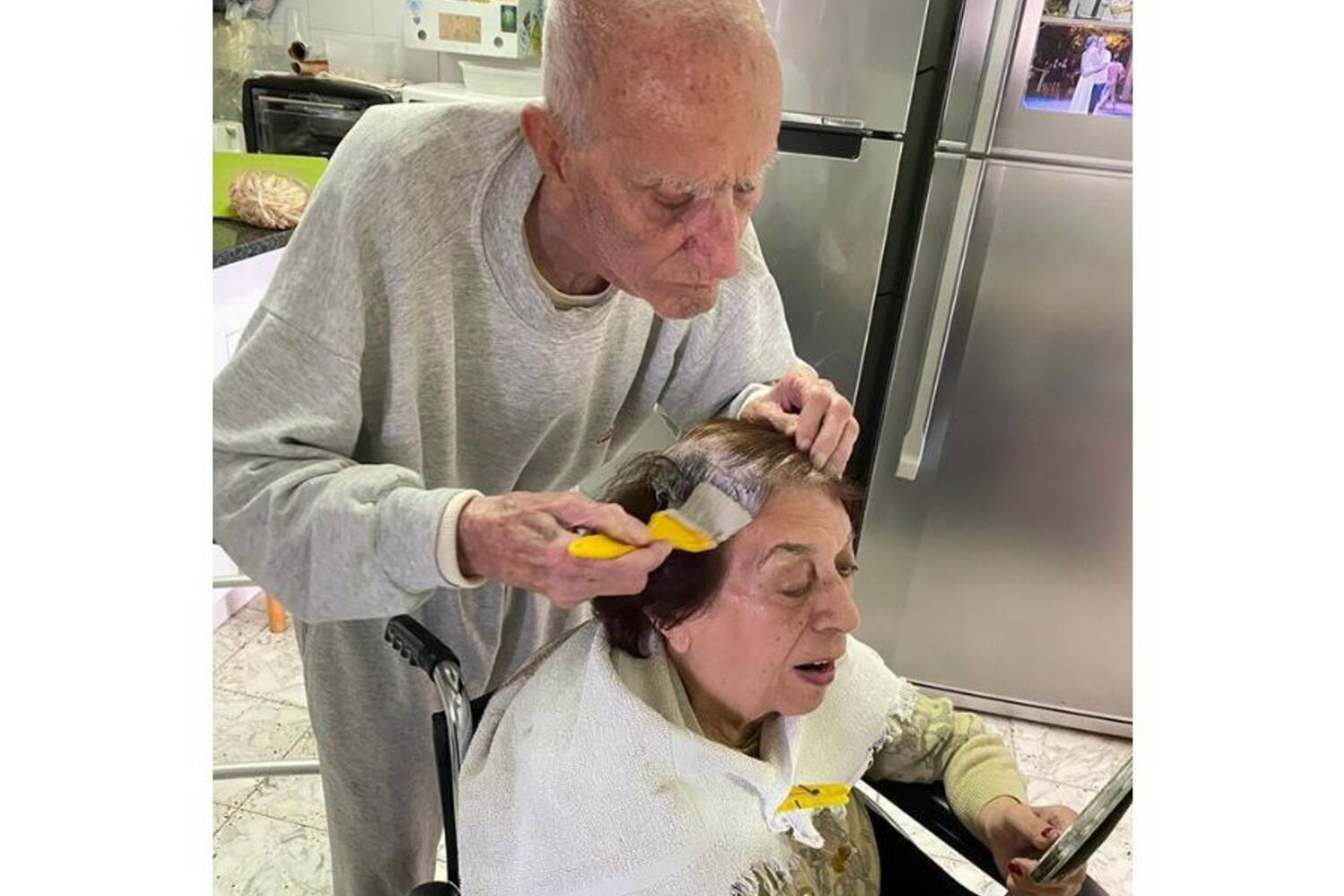 Um homem, de 92 anos, faz tudo para que a sua companheira, também de 92, se sinta bonita e não 'sofra' por não poder ir ao cabeleireiro durante o período de quarentena devido ao coronavírus.O momento foi relatado pela neta de ambos, Yael Shapira Avraham, que publicou uma fotografia que mostra o casal no momento ternurento, em Israel. Na imagem é possível ver o avô a pintar os cabelos da mulher que, sentada na cadeira de rodas, vai acompanhando todo o processo através de um espelho.