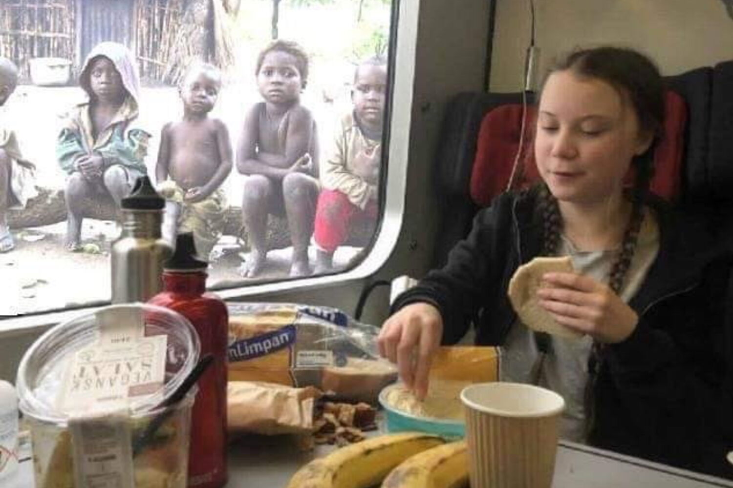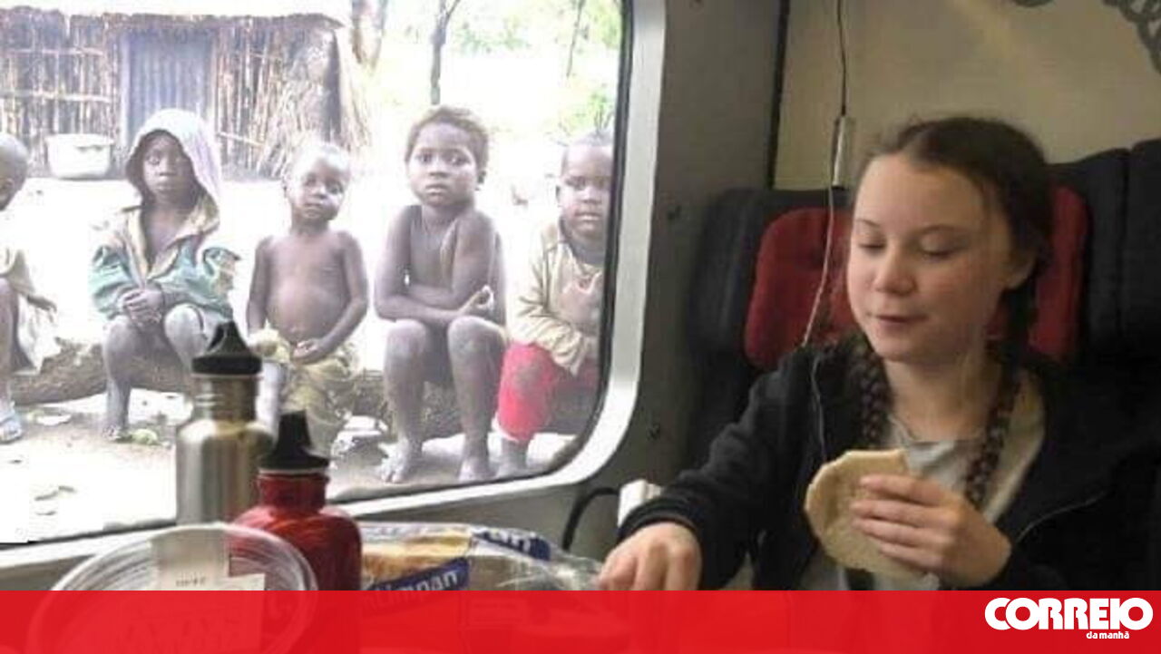 Na imagem, é possível ver a jovem de 16 anos a comer sentada num comboio, observada por crianças negras no lado de fora da janela. A fotografia é uma montagem feita a partir de uma publicação feita por Greta no seu Instagram, em janeiro deste ano. Na imagem verdadeira, a paisagem do comboio são apenas árvores.