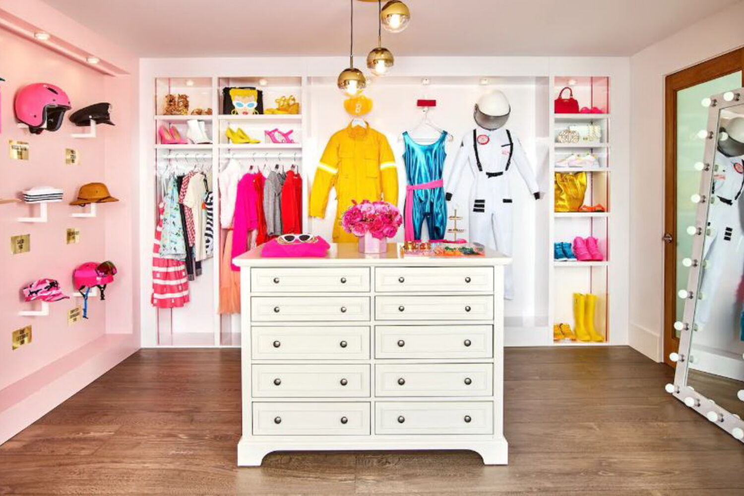 A casa tem três pisos e um jardim de cortar a respiração, onde nem o icónico escorrega cor de rosa que liga a varanda à piscina falta. Há um closet gigante cheio de roupas dignas de um fã da Barbie, uma sala de cinema e um tranquilo terraço de meditação.