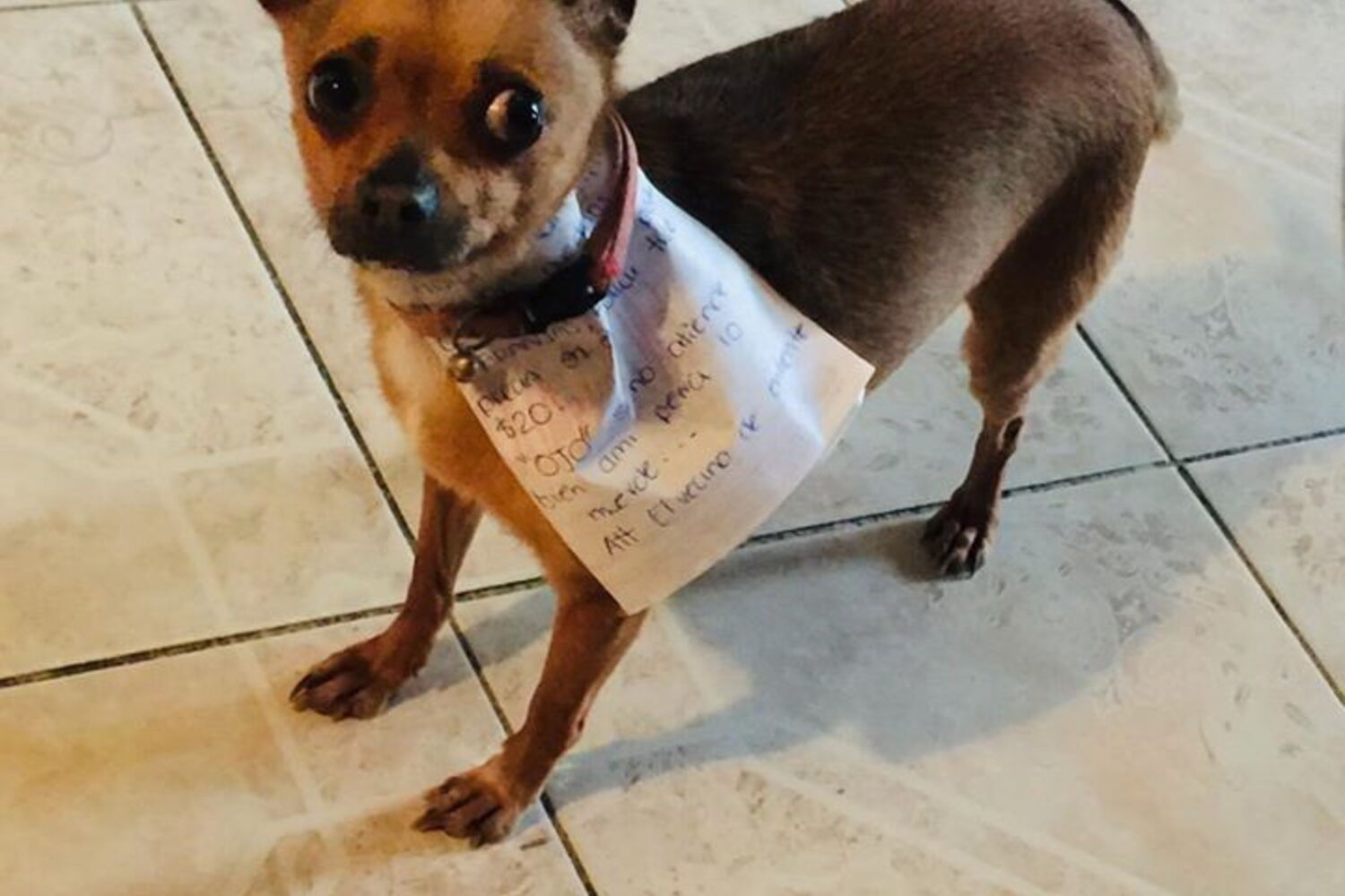 0 dólares americanos presos ao colarinho. AVISO: Ela morderá se não for tratada corretamente. O vizinho da frente".António captou o momento em que a cadela regressou com o pacote de Cheetos correto e partilhou a imagem na rede social Facebook.