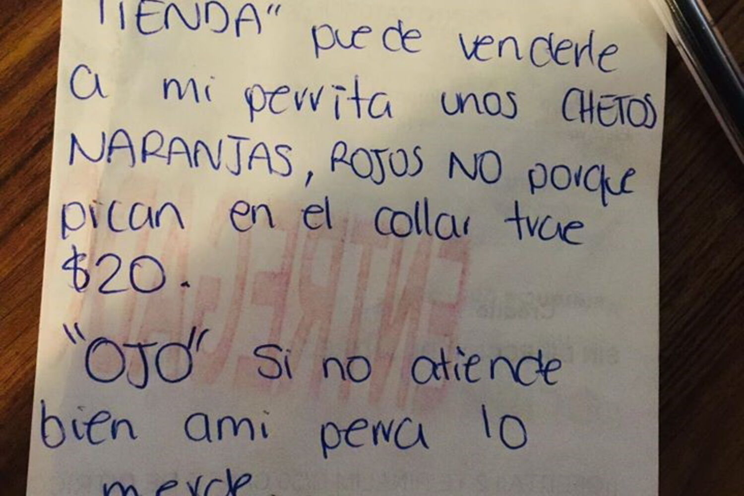 Na nota podia ler-se: "Olá Sr. Lojista. Por favor, venda ao meu cão alguns Cheetos, do tipo laranja, e não vermelhos, porque são muito picantes", referiu, acrescentando que o animal tinha "2