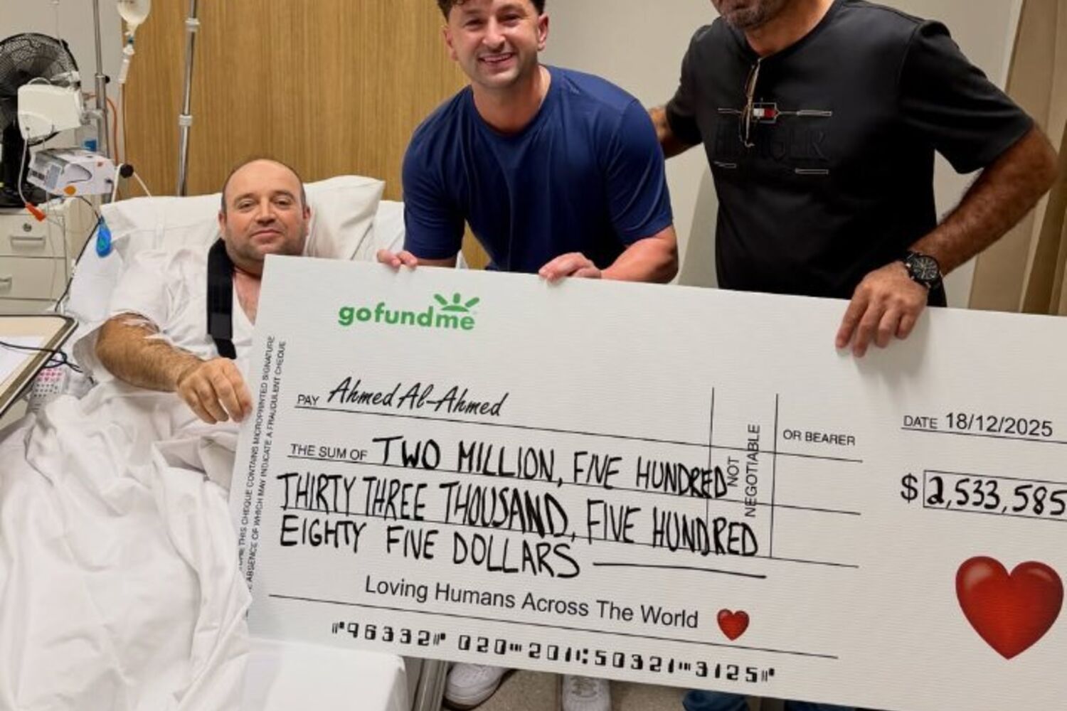Ahmed Al-Ahmed, o herói que desarmou um atirador durante o ataque na praia de Bondi, em Sydney, Austrália, no passado domingo, recebeu um cheque de doações no valor de 2,5 milhões de dólares no hospital.