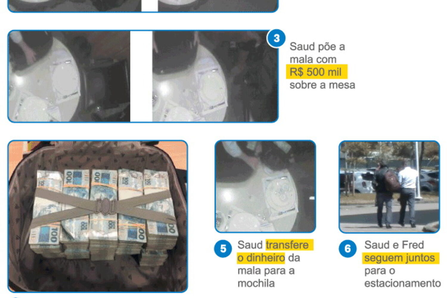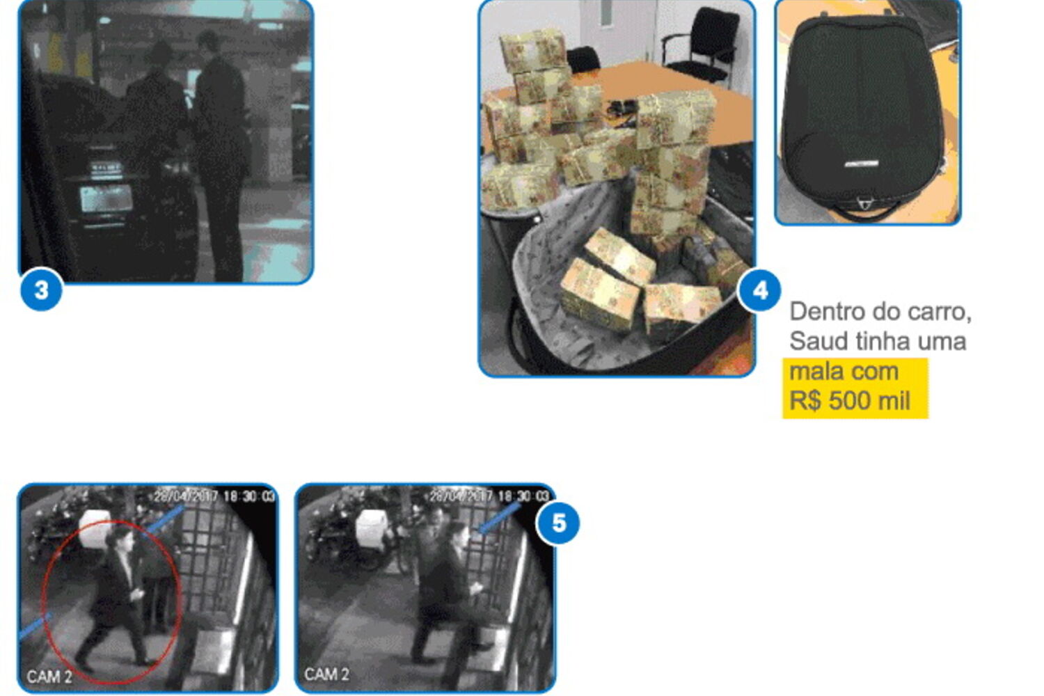 O jornal O Globo divulgou esta quinta-feira algumas imagens captadas por câmaras de videovigilância da Polícia Federal brasileira que mostram Ricardo Saud, o diretor de relações institucionais da JBS, cujo proprietário é Joesley Baptista, a entregar dinheiro a emissários de Michel Temer e de Aécio Neves.