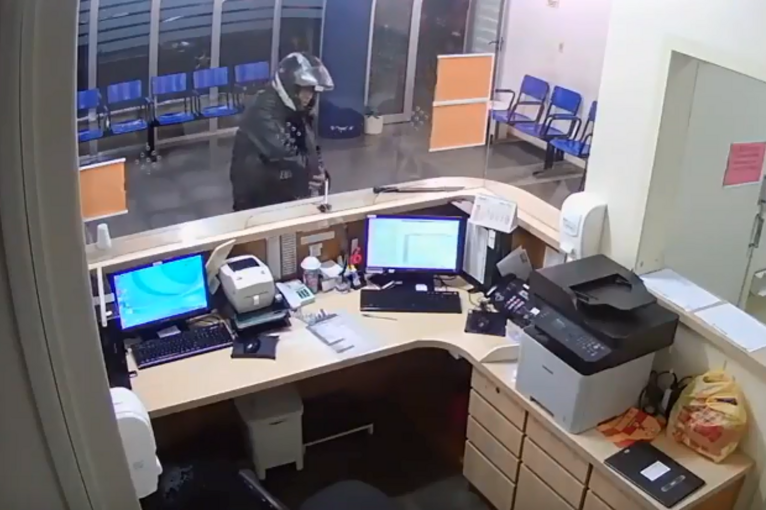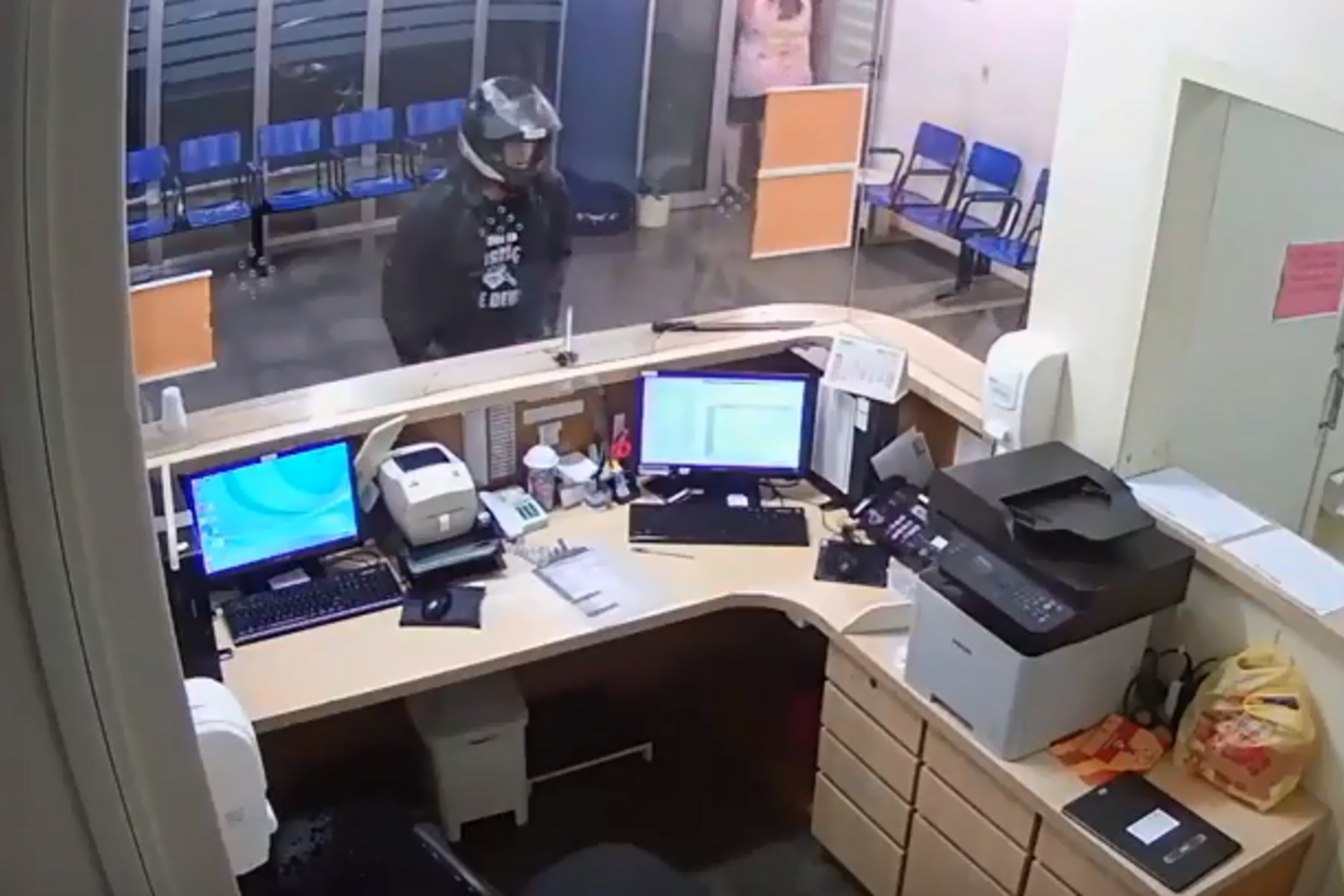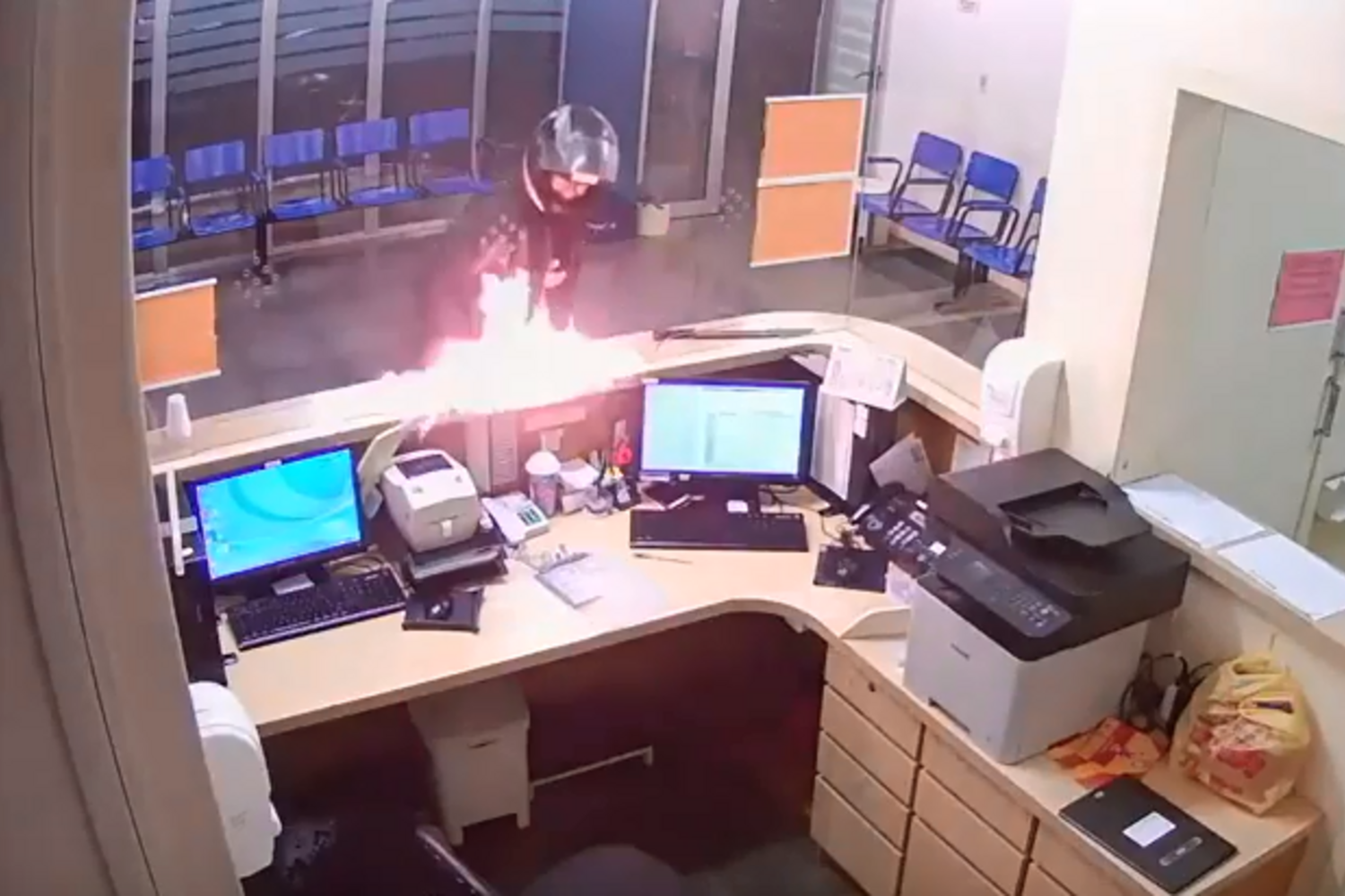 Nas imagens de videovigilância é possível ainda ver o homem a entrar de capacete e a colocar uma faca de grandes dimensões em cima do balcão. A funcionária e alguns pacientes afastam-se e o incendiário agarra numa garrafa com combustível, lançando o líquido para a recepção. Em seguida, começa a procurar o isqueiro. Primeiro nos bolsos das calças, depois do casaco, novamente nas calças, até que, já visivelmente em pânico, encontra o objeto e incendeia a recepção da unidade hospitalar.