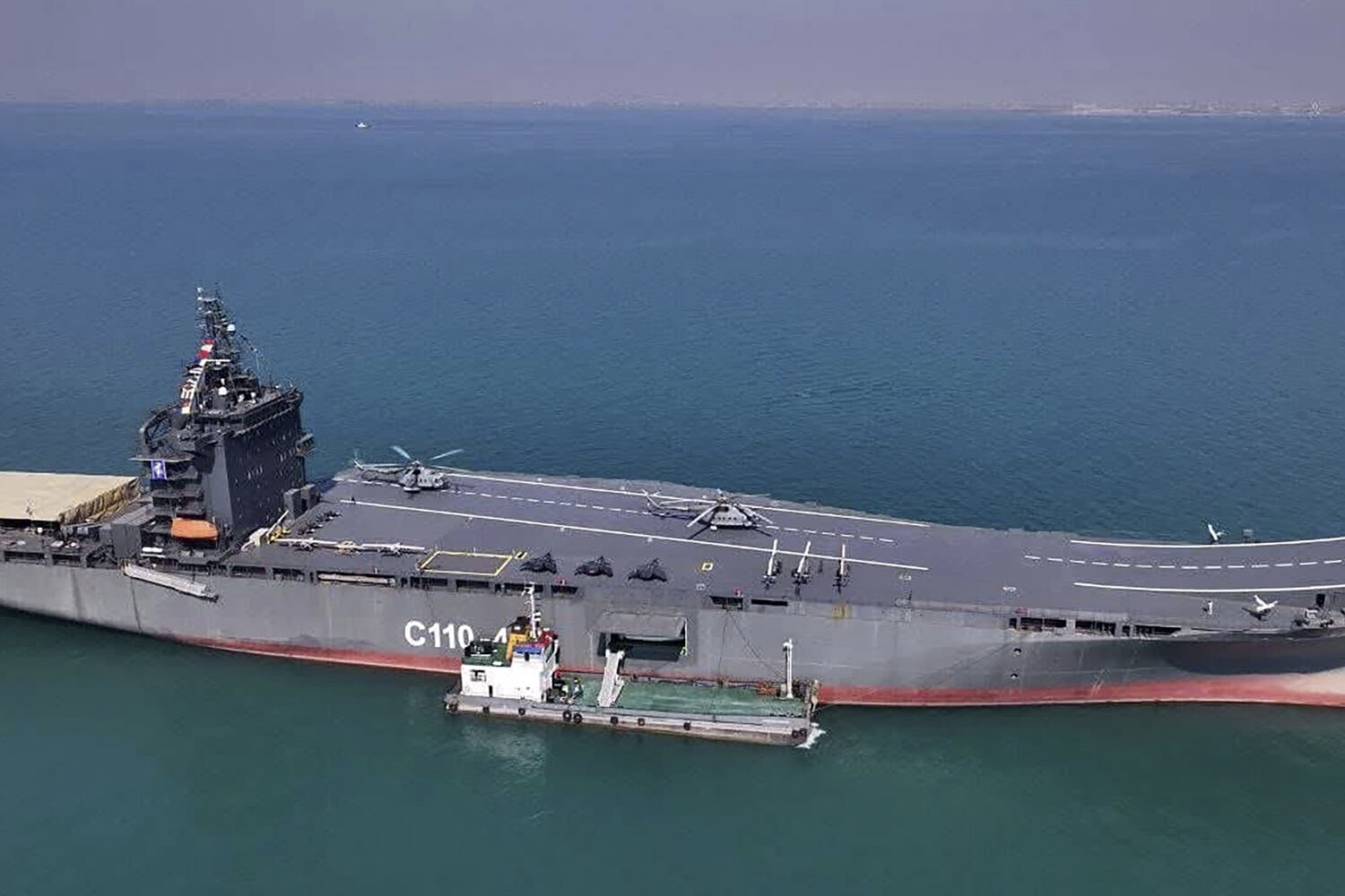 As imagens transmitidas pela televisão estatal mostraram pelo menos quatro helicópteros e três drones na pista do navio.