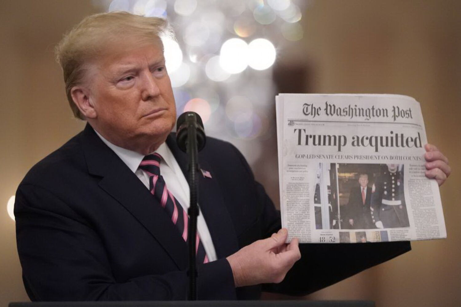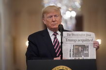"Já errei na minha vida", afirmou, "mas este é o resultado final", acrescentou. Foi nesta altura que o Presidente dos EUA pegou num exemplar do jornal Washington Post onde se pode ler, na capa, "Trump absolvido".