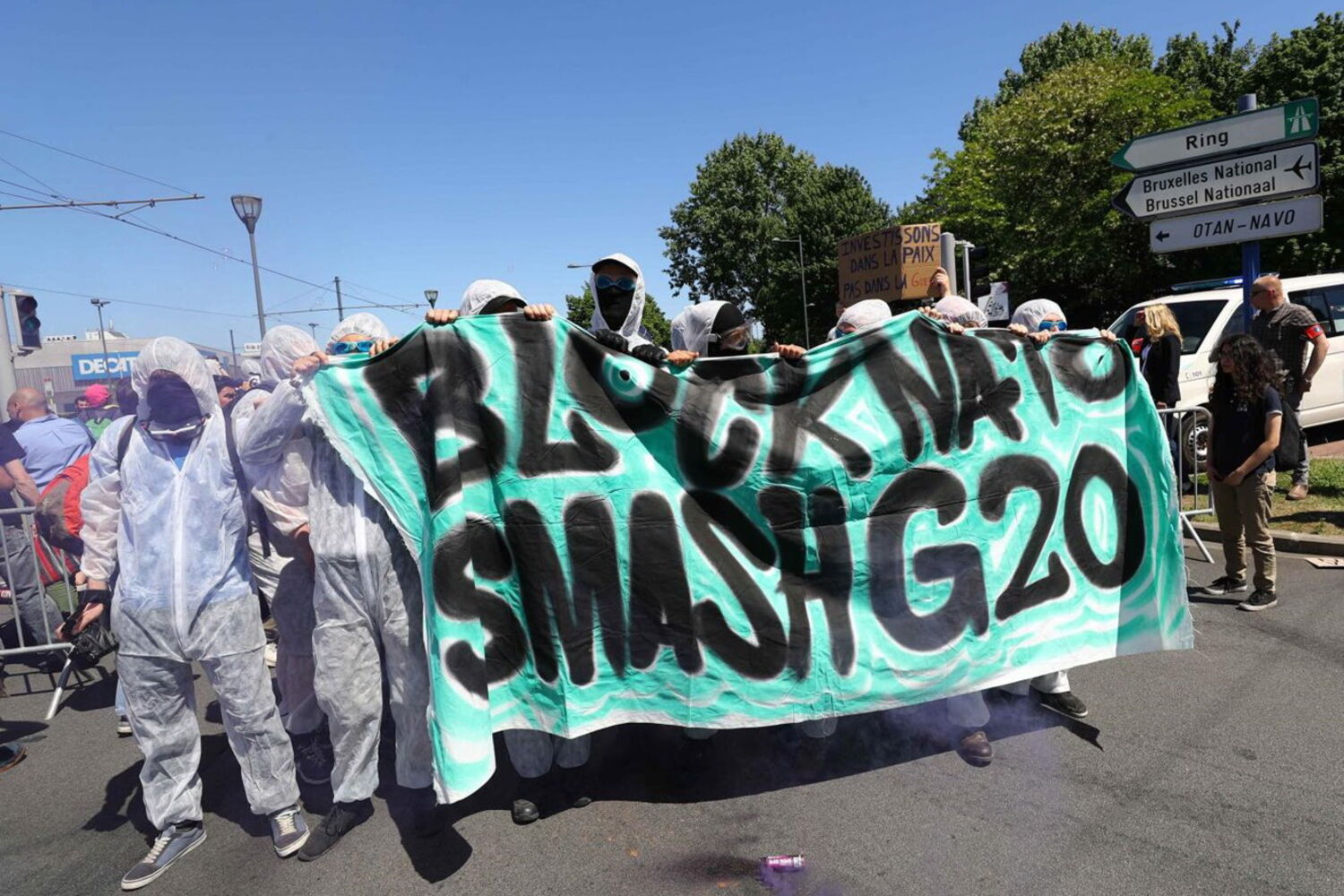 Os ativistas também exibiram três bandeiras em estruturas metálicas utilizadas para colocar sinais de trânsito, na área que liga a sede da NATO ao aeroporto de Bruxelas.