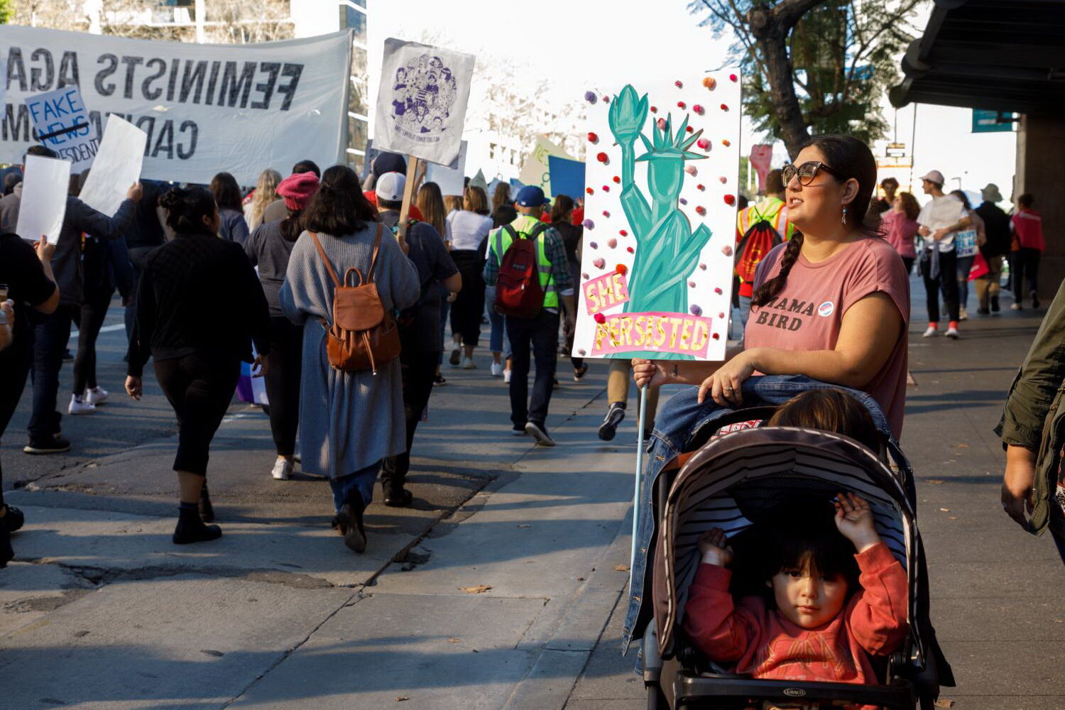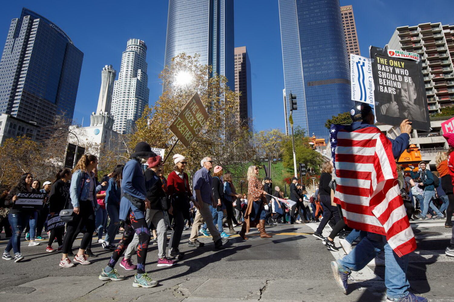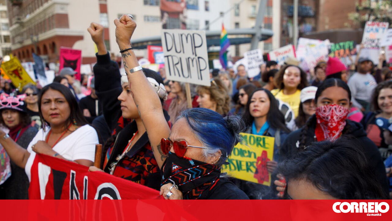 Os manifestantes, que desembocaram em frente à Câmara Municipal da maior cidade californiana, ouviram políticos, ativistas e celebridades de Hollywood apelarem à mobilização e união a caminho das eleições presidenciais de 2020.