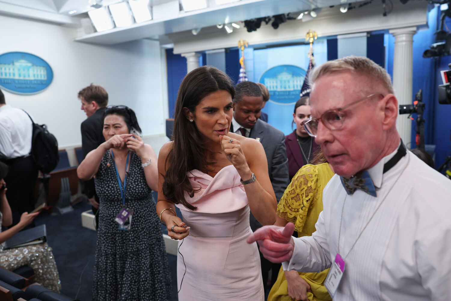 A secretária de imprensa da Casa Branca, Karoline Leavitt, também foi uma das figuras de destaque nos lugares próximos do líder dos EUA. O diretor do FBI, Kash Patel, também participou na cerimónia. A presidente da Associação de Correspondentes da Casa Branca, responsável pela organização do evento anual de gala, também estava sentada ao lado de Donald Trump no momento do tiroteio. "Numa noite em que nos reunimos para celebrar as liberdades e a Primeira Emenda, também temos de refletir sobre a fragilidade delas neste país, porque... tiroteios e tentativas de tiroteio acontecem todos os dias", referiu na reação após o sucedido.