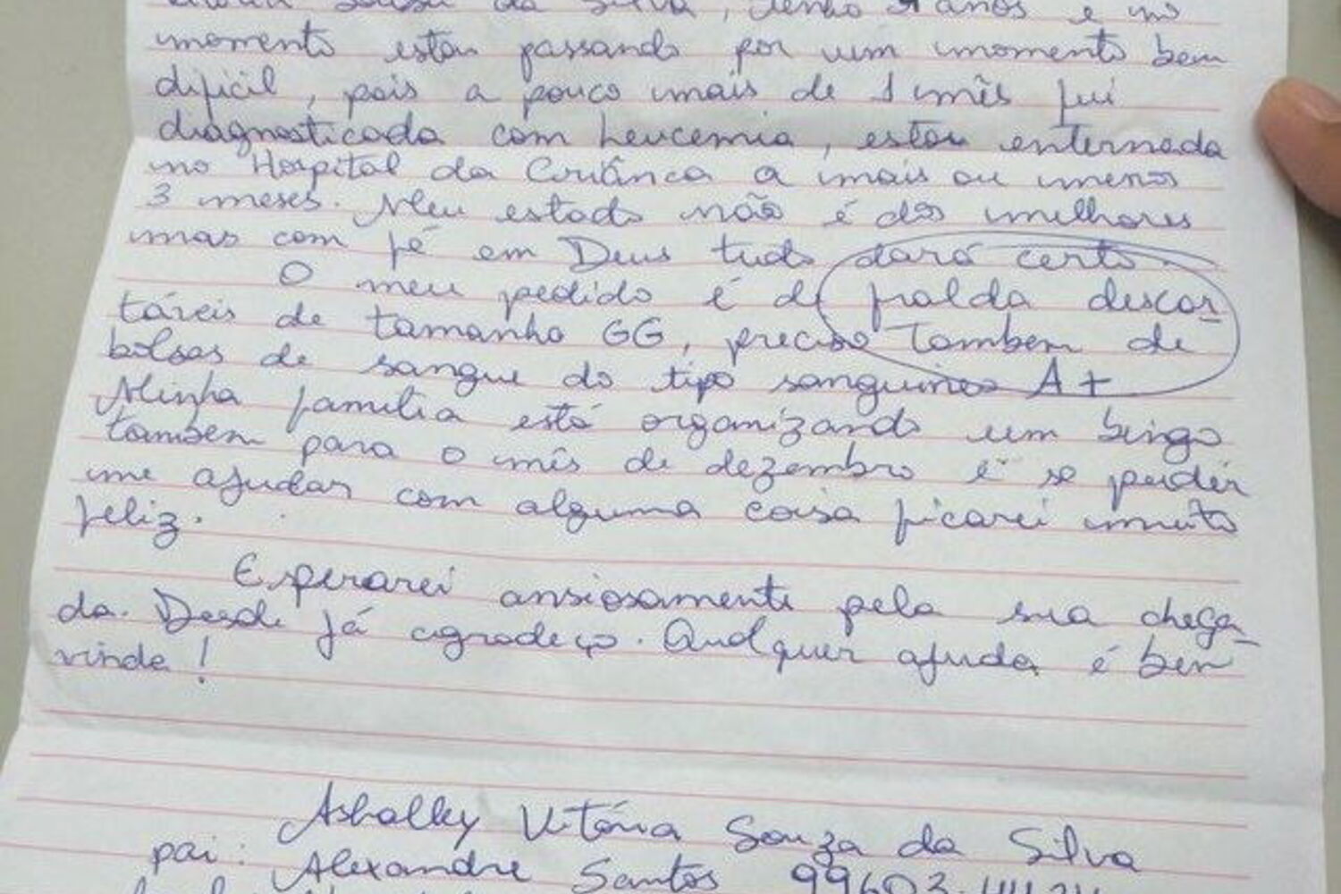"Olá, Pai Natal, me chamo Ashalley Vitória, tenho 4 anos, e estou a passar por um momento bem difícil, há pouco mais de um mês fui diagnosticada com leucemia. O meu pedido são fraldas descartáveis GG e bolsas de sangue A+ ", escreveu a criança, segundo o mesmo jornal.