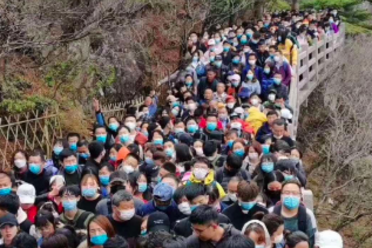 Imagens captadas na reserva natural da Montanha Huangshan, na província de Anhui, mostram milhares de pessoas amontoadas, muitas delas a usar máscaras. Às 07h00 de sábado, foi emitido o aviso que o parque já tinha atingido a sua capacidade máxima de visitantes e que não aceitaria mais turistas ao longo do dia.