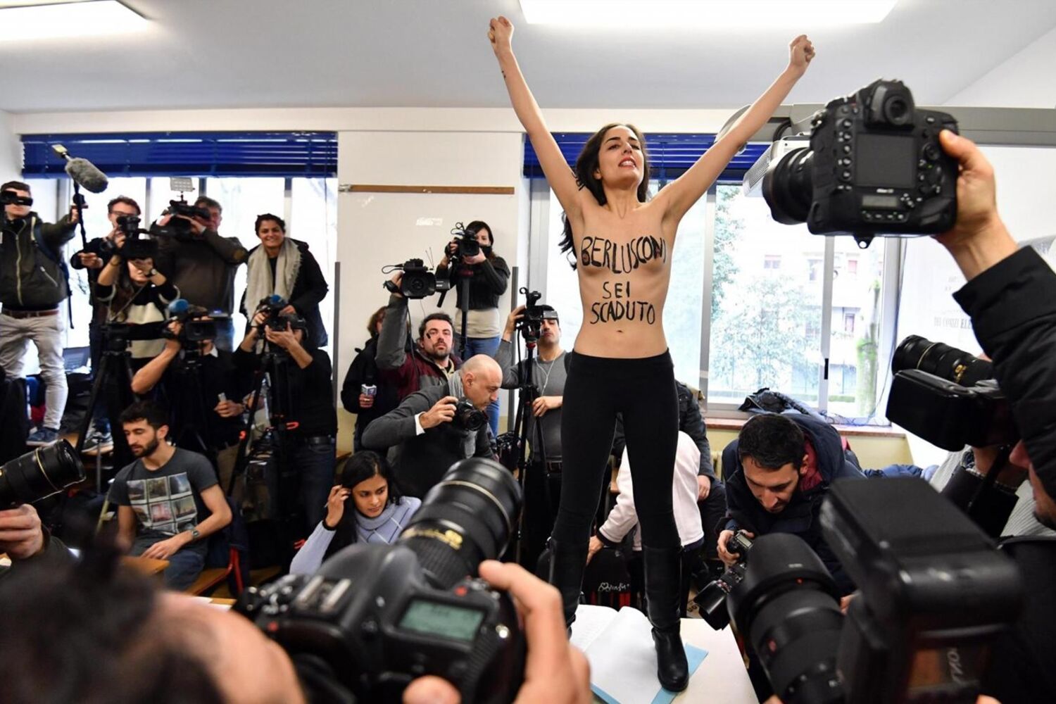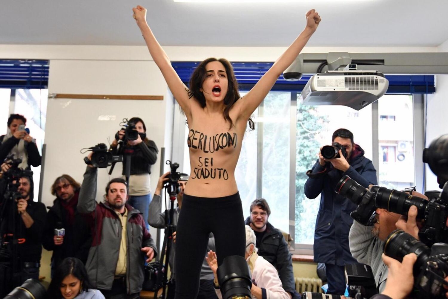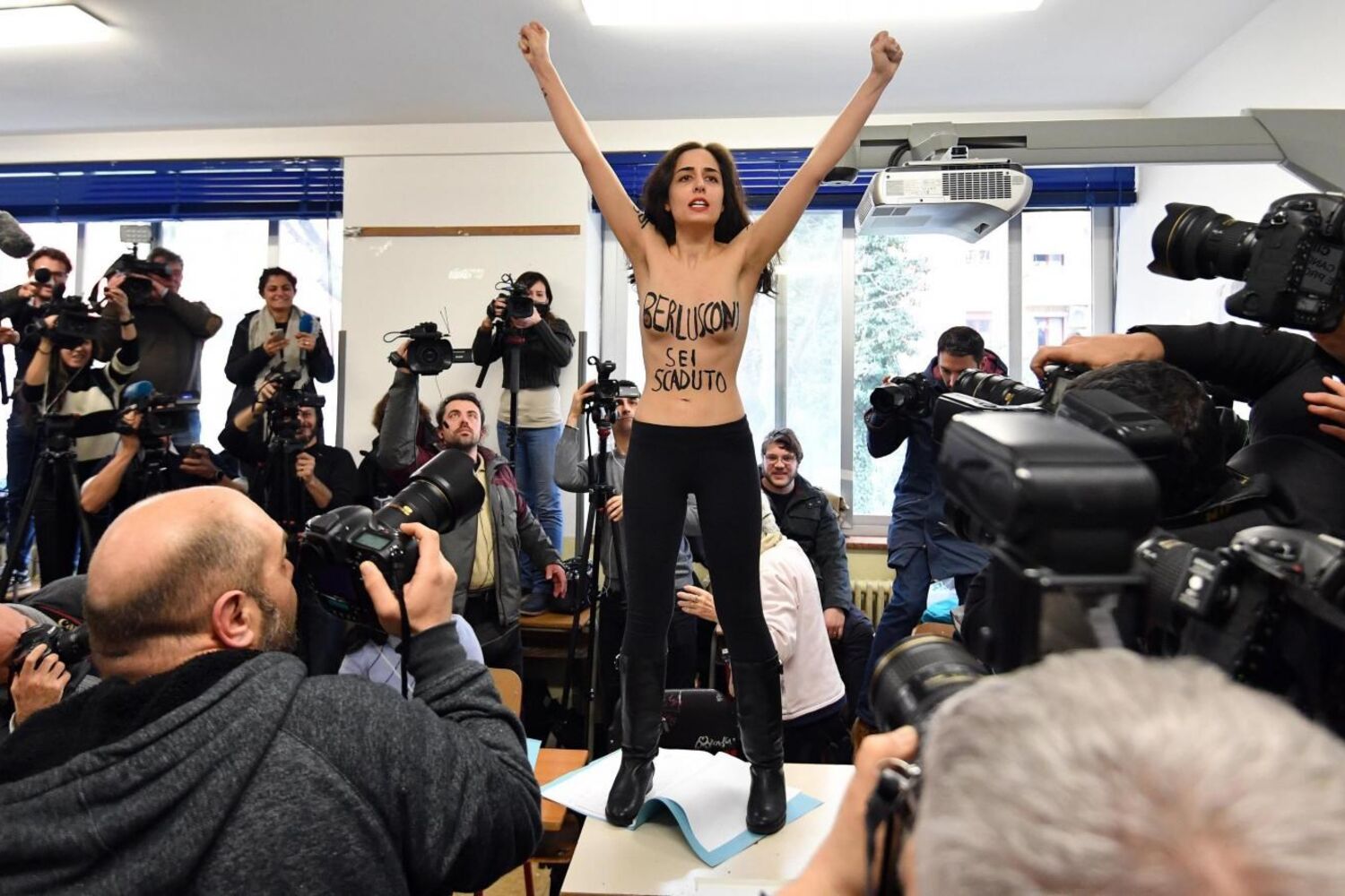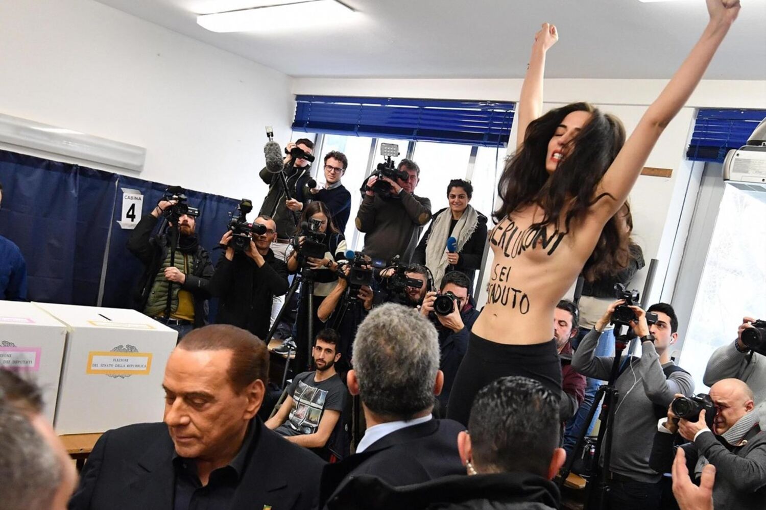 Sílvio Berlusconi já votou. Quando o antigo primeiro-ministro, que pertence à aliança entre Forza Italia e a Liga (extrema-direita, antiga Liga do Norte), foi votar, uma activista da FEMEN apareceu em topless (nua da cintura para cima) que subiu para cima da mesa de voto. Veja o momento.