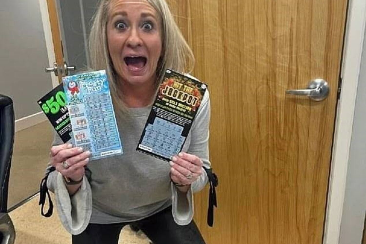 Lori Janes, de Louisvill, estado do Kentucky, nos EUA, recebeu raspadinhas da Hit the jackpot no dia 13 de dezembro, numa festa do escritório onde trabalha, reporta a CNN Internacional.