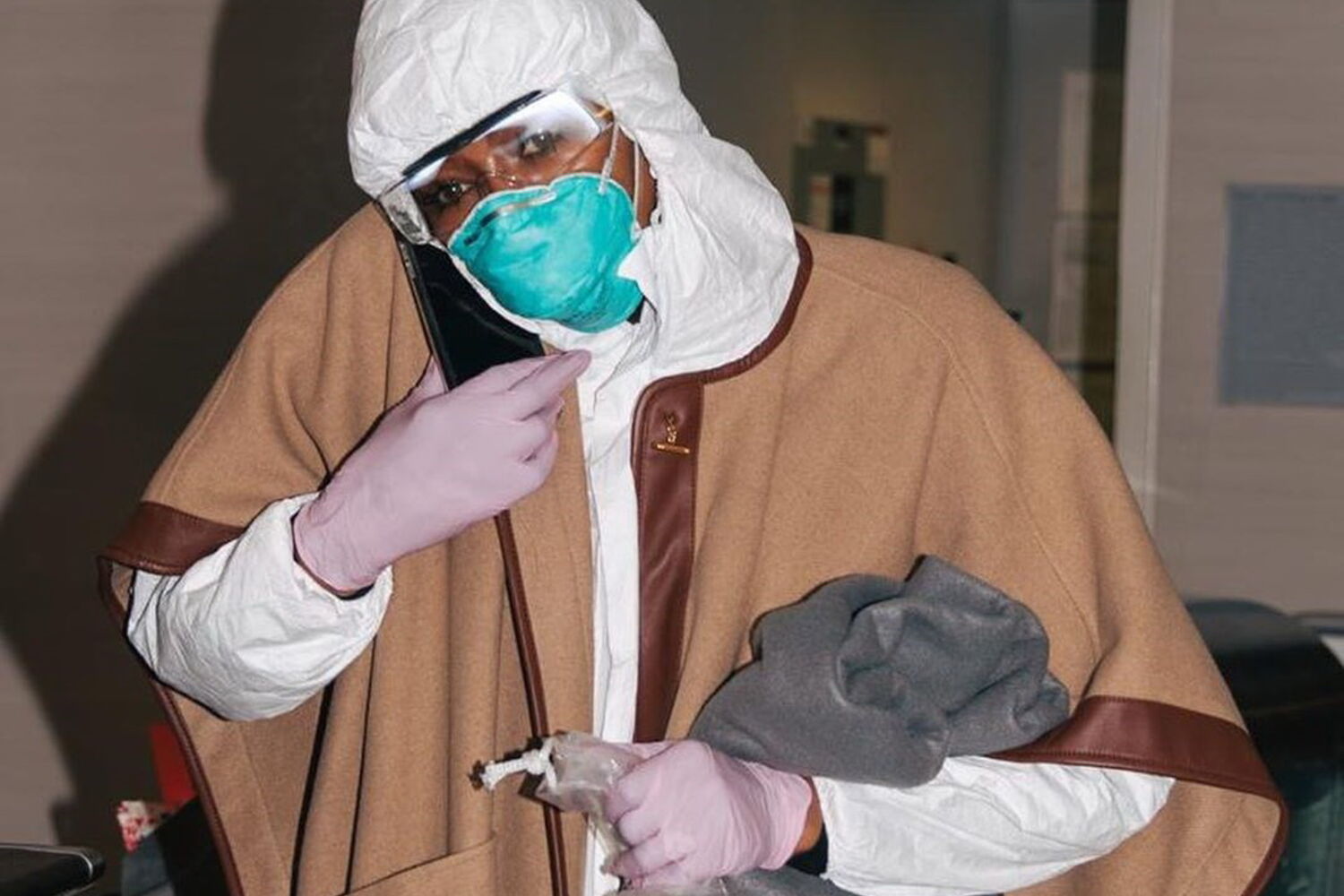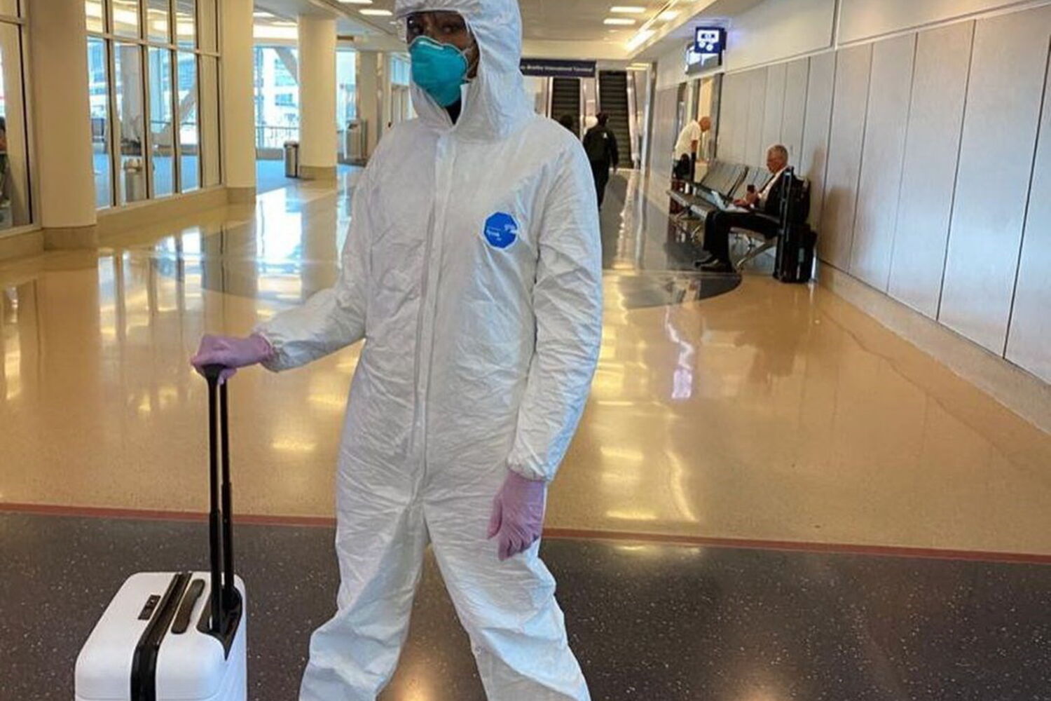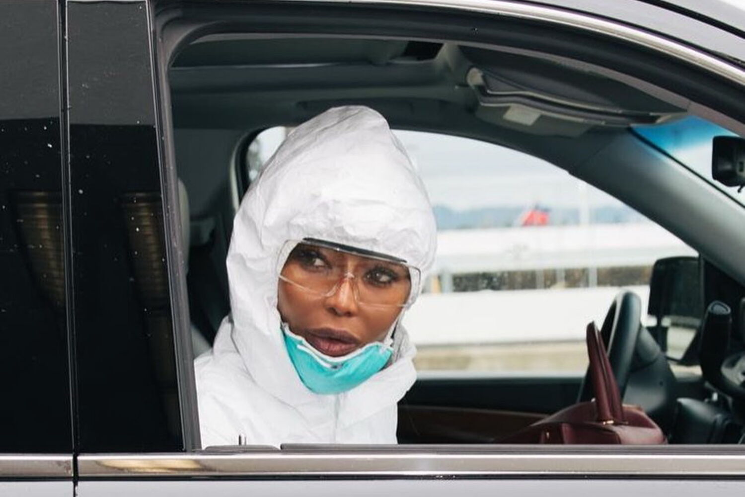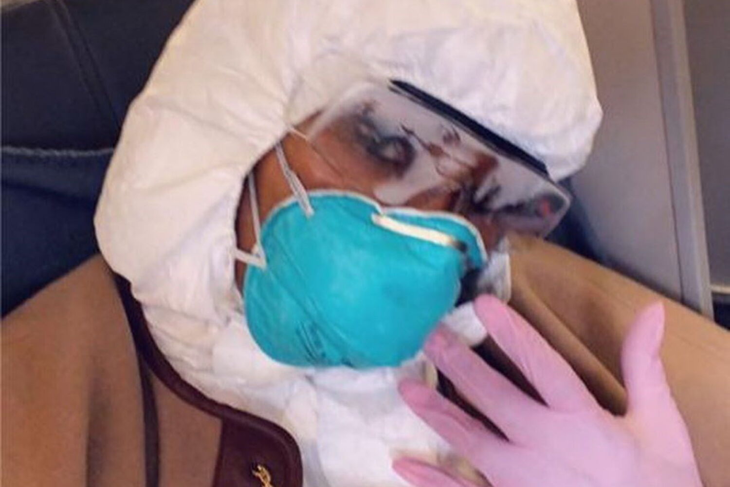 A supermodelo foi viajar de avião, mas para isso utilizou um fato de isolamento branco de corpo inteiro, uma máscara, óculos de segurança e luvas roxas.