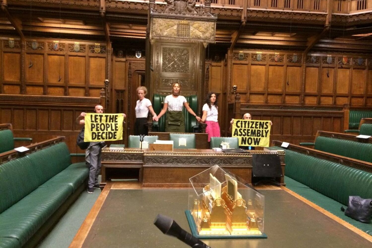 O grupo "Extinction Rebellion" publicou uma fotografia na rede social Twitter onde mostrou manifestantes dentro da Câmara dos Comuns a segurar cartazes onde se lia: "Deixem o povo decidir" e "Assembleia dos Cidadãos agora".