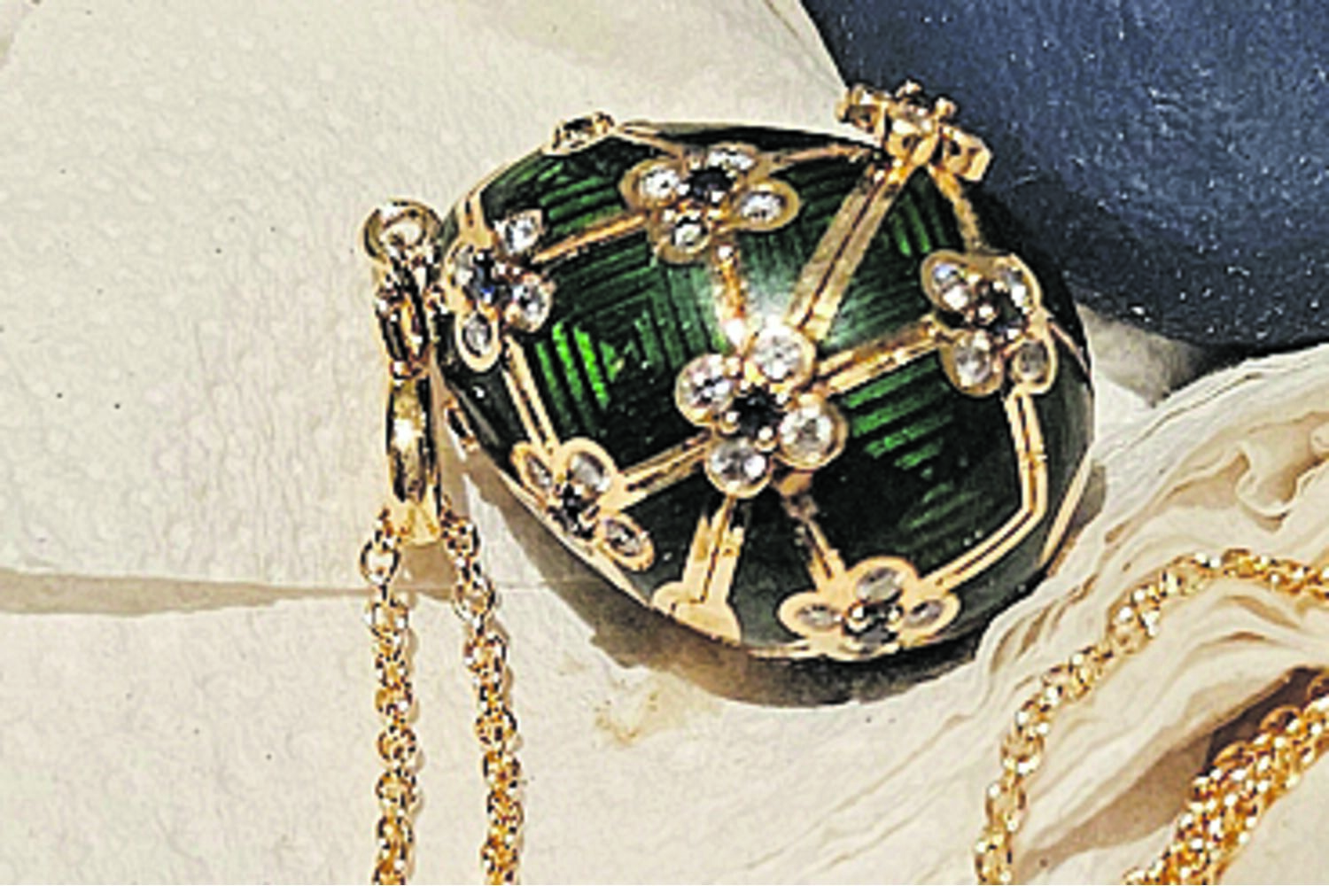 Peça é uma das joias de luxo criadas pela Casa Russa Fabergé, há mais de 100 anos e tem 60 diamantes brancos e 15 safiras azuis.