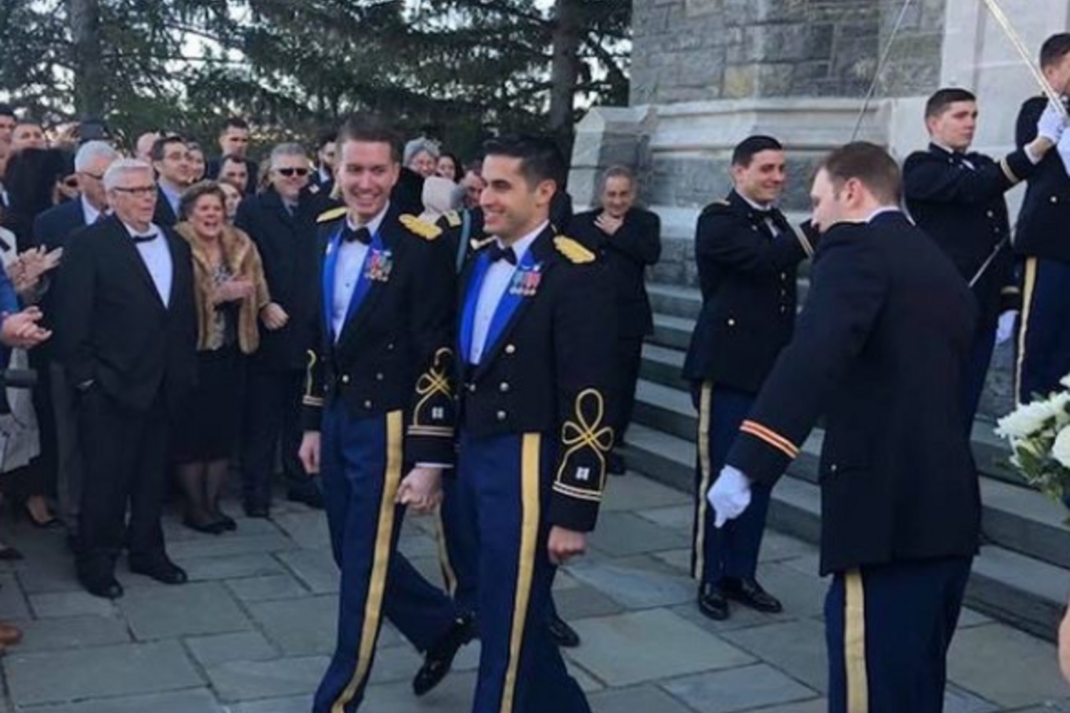 Daniel Hall, de 30 anos, e Vincent Franchino, de 26, os dois capitães do exército norte-americano, casaram-se na academia militar de West Point, em Nova Iorque, onde se conheceram.