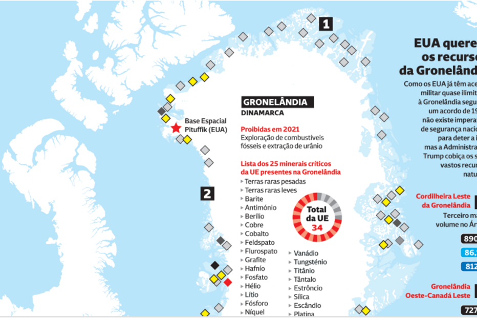 A maior ilha do Mundo, com 2,16 milhões de quilómetros quadrados e cerca de 57 mil habitantes, detém importantes reservas de petróleo e gás natural, e extensos depósitos de terras raras (grupo de elementos químicos essenciais para a indústria de tecnologia de ponta).