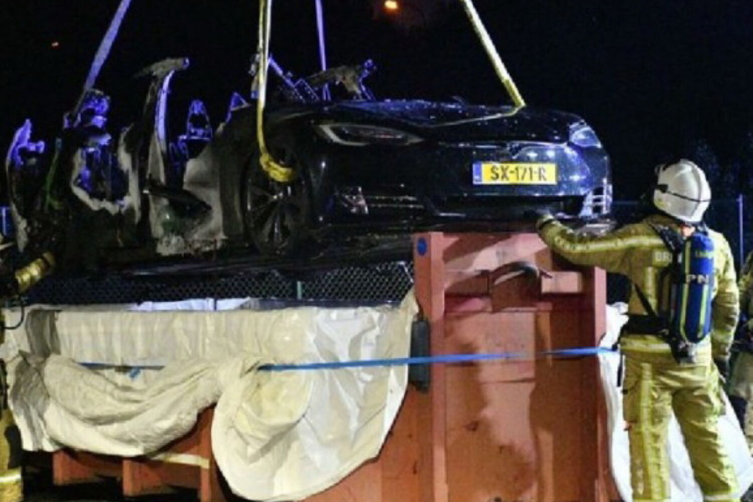 Os bombeiros colocaram o Tesla dentro de um contentor com água até ao dia seguinte, para garantir que as chamas não reacendessem durante a noite.