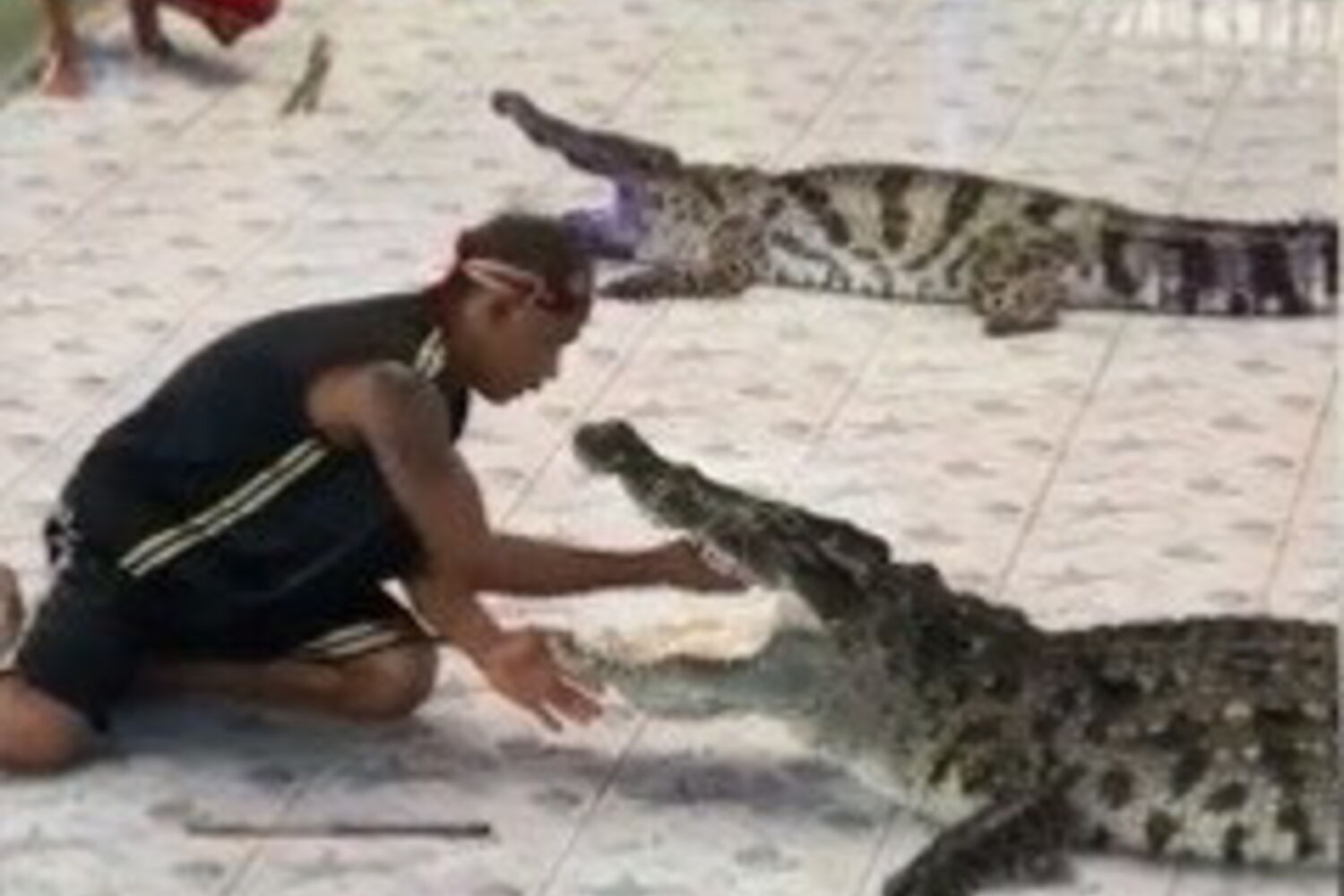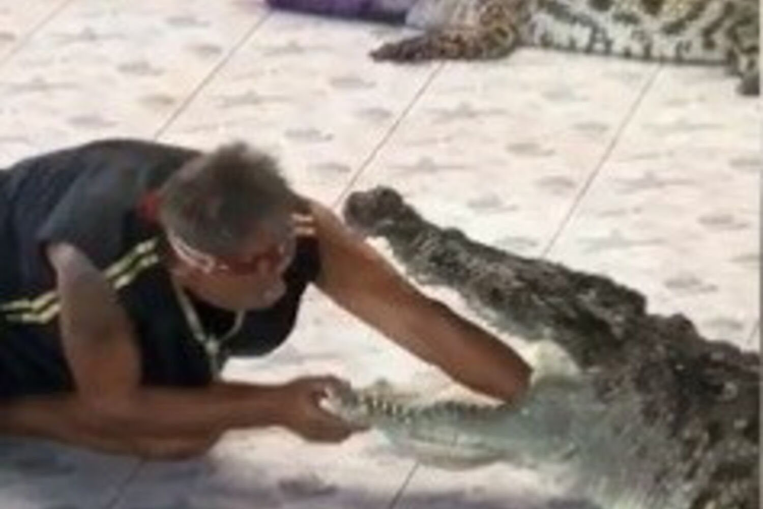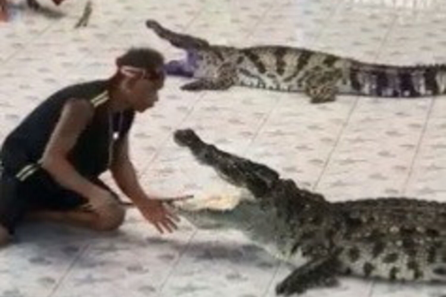 Nas imagens é possível ver o homem a pôr o braço dentro das mandíbulas do crocodilo, quando o réptil se descontrola e morde o tratador atirando o homem violentamente de um lado para o outro.