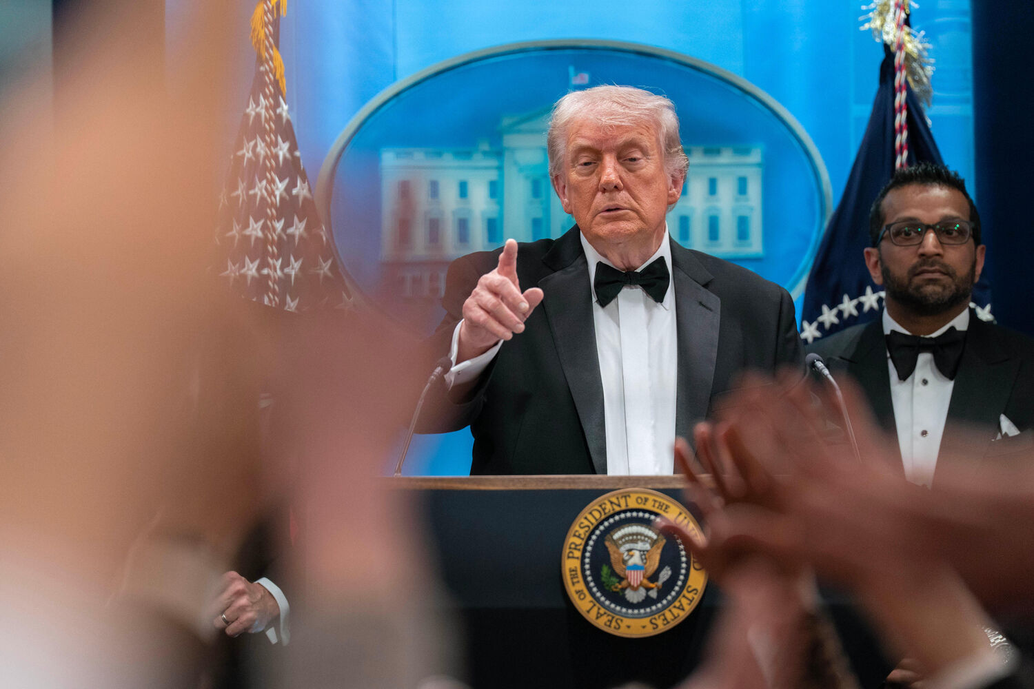 Assim que se aperceberam do tiroteio, os agentes norte-americanos evacuaram o espaço onde decorria a cerimónia com mais de 2500 convidados e retiraram da sala Donald Trump, que estava acompanhado pela mulher Melania, e o vice-presidente dos EUA, JD Vance. Neste momento, Trump fez o seguinte pedido às autoridades: "Esperem um minuto, esperem um minuto. Deixem-me ver. Esperem um minuto".