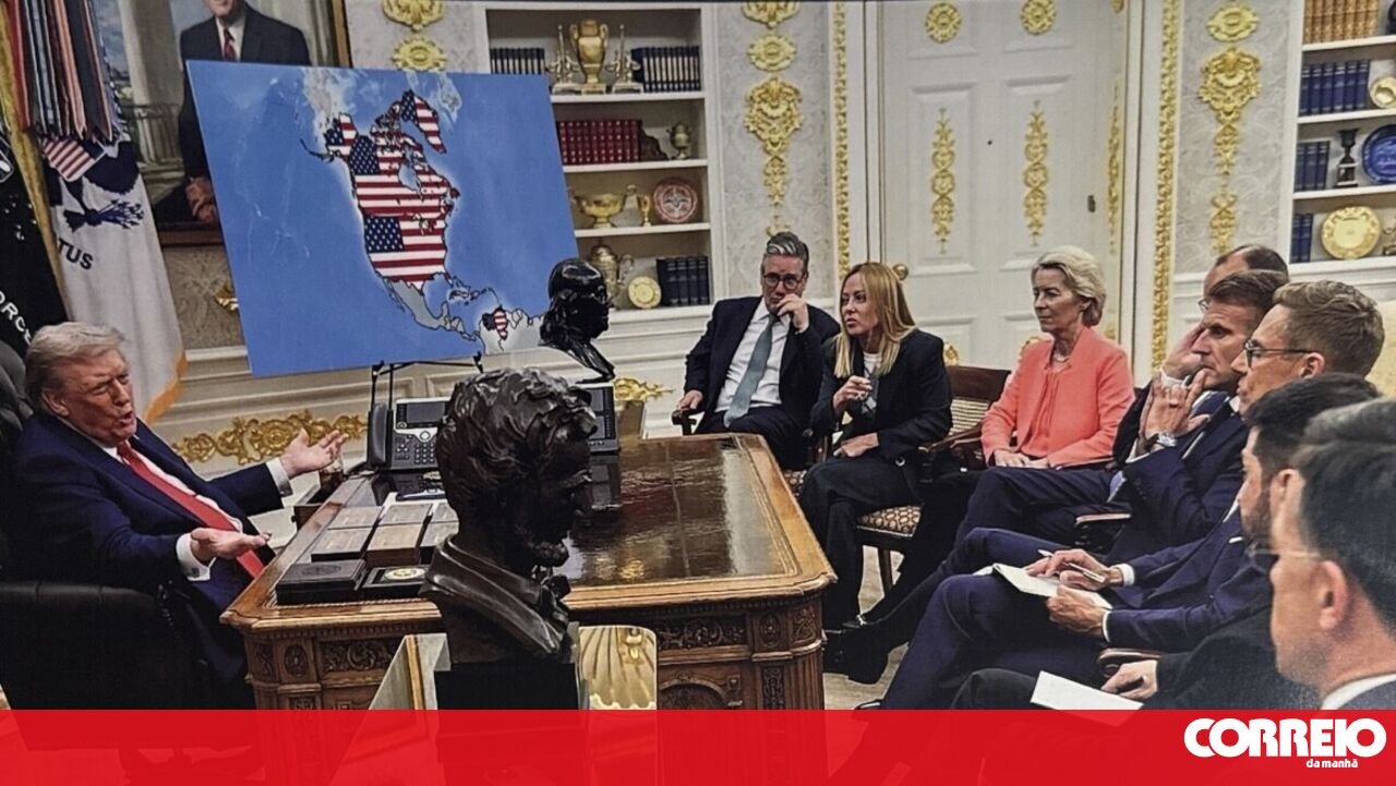 O presidente norte-americano, Donald Trump, partilhou uma imagem, aparentemente editada por Inteligência Artificial, que o mostra sentado ao lado de um mapa dos EUA que inclui a Gronelândia, o Canadá e a Venezuela, enquanto conversa com líderes europeus.