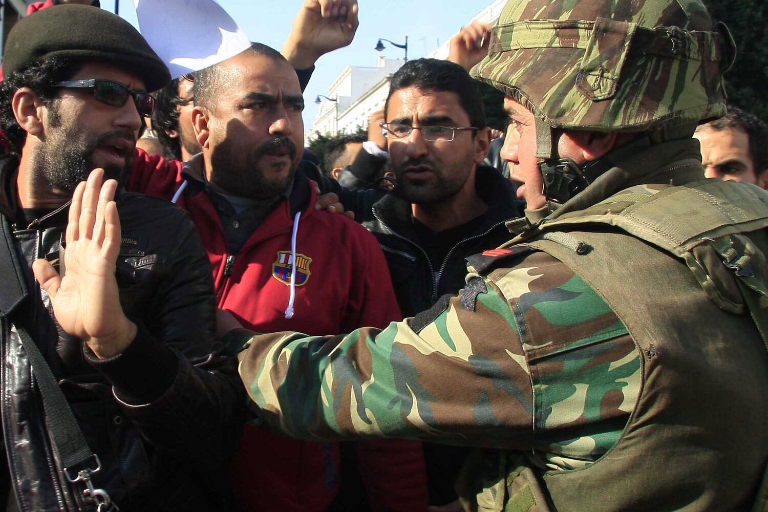 O protesto reuniu cerca de 100 pessoas, segundo a France Presse, ou 200, segundo a Associated Press, na avenida Habib Bourguiba, no centro de Tunes. A polícia disse aos manifestantes para dispersarem, dado estar em vigor o estado de emergência que proíbe qualquer reunião pública de mais de três pessoas, e disparou granadas de gás lacrimogéneo.