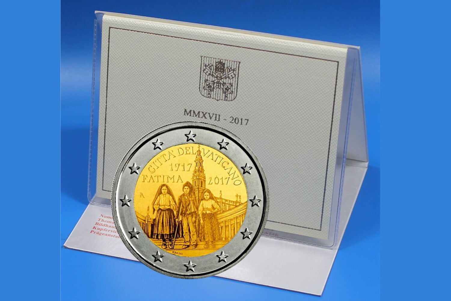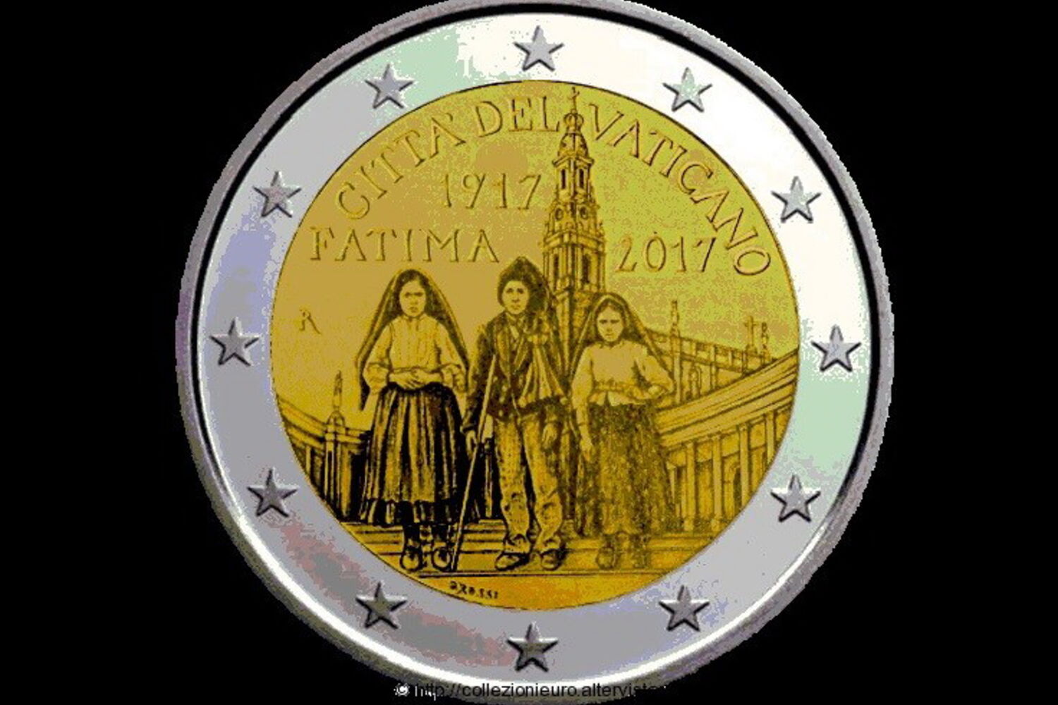 Numa nota publicada na página oficial da Santa Sé, lê-se que o Gabinete de Filatelia e Numismática do Vaticano celebra o Centenário das Aparições com uma nova moeda de dois euros, na qual estão representados os três pastorinhos - Lúcia, Francisco e Jacinta - e o santuário de Fátima.