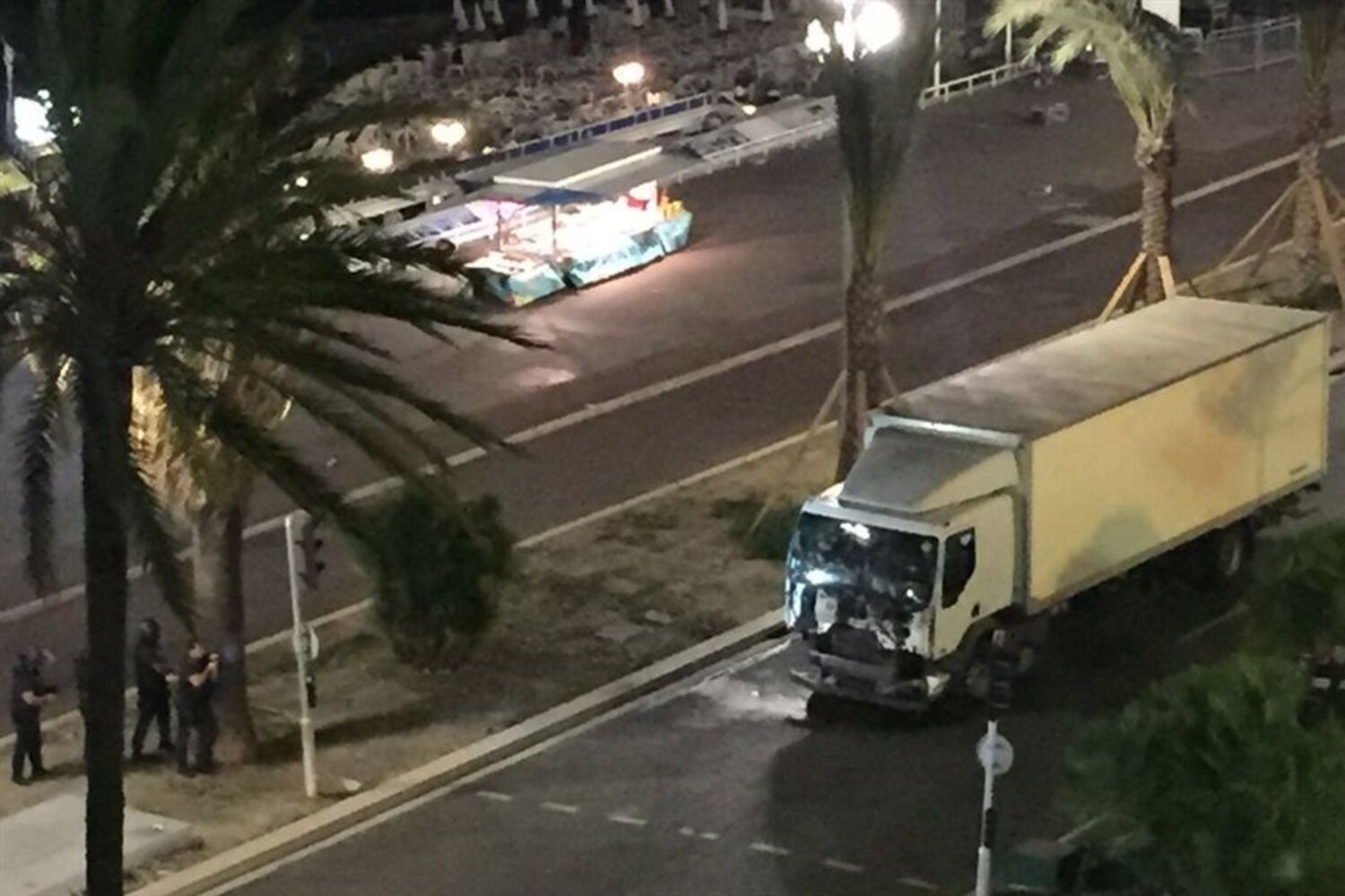 O veículo pesado atropelou a multidão que tinha acabado de assistir ao fogo de artifício na cidade, não tendo parado de acelerar. O camião abalroou as pessoas ao longo de pelo menos dois quilómetros. A polícia acabou por abater o autor do ataque a tiro. Foram encontradas várias armas e granadas dentro do veículo.