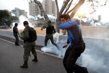 Um conjunto de tanques da Guarda Nacional avançaram contra manifestantes nas ruas de Caracas, na tarde desta terça-feira. Os militares perseguiram alguns civis, após serem alvo de disparos e apedrejamento.