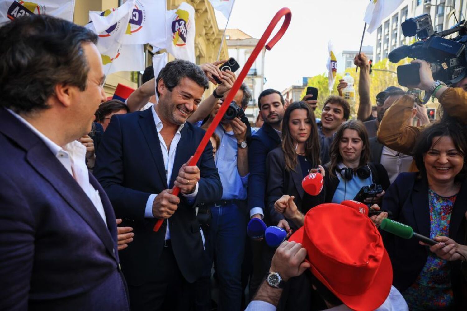 O calendário da semana da Queima das Fitas do Porto estipula que terça-feira é dia de cortejo dos estudantes da academia e, como este ano, se misturou com o calendário da campanha, o líder do Chega cruzou-se com alguns finalistas, que levavam a tradicional cartola na cabeça e a bengala na mão.