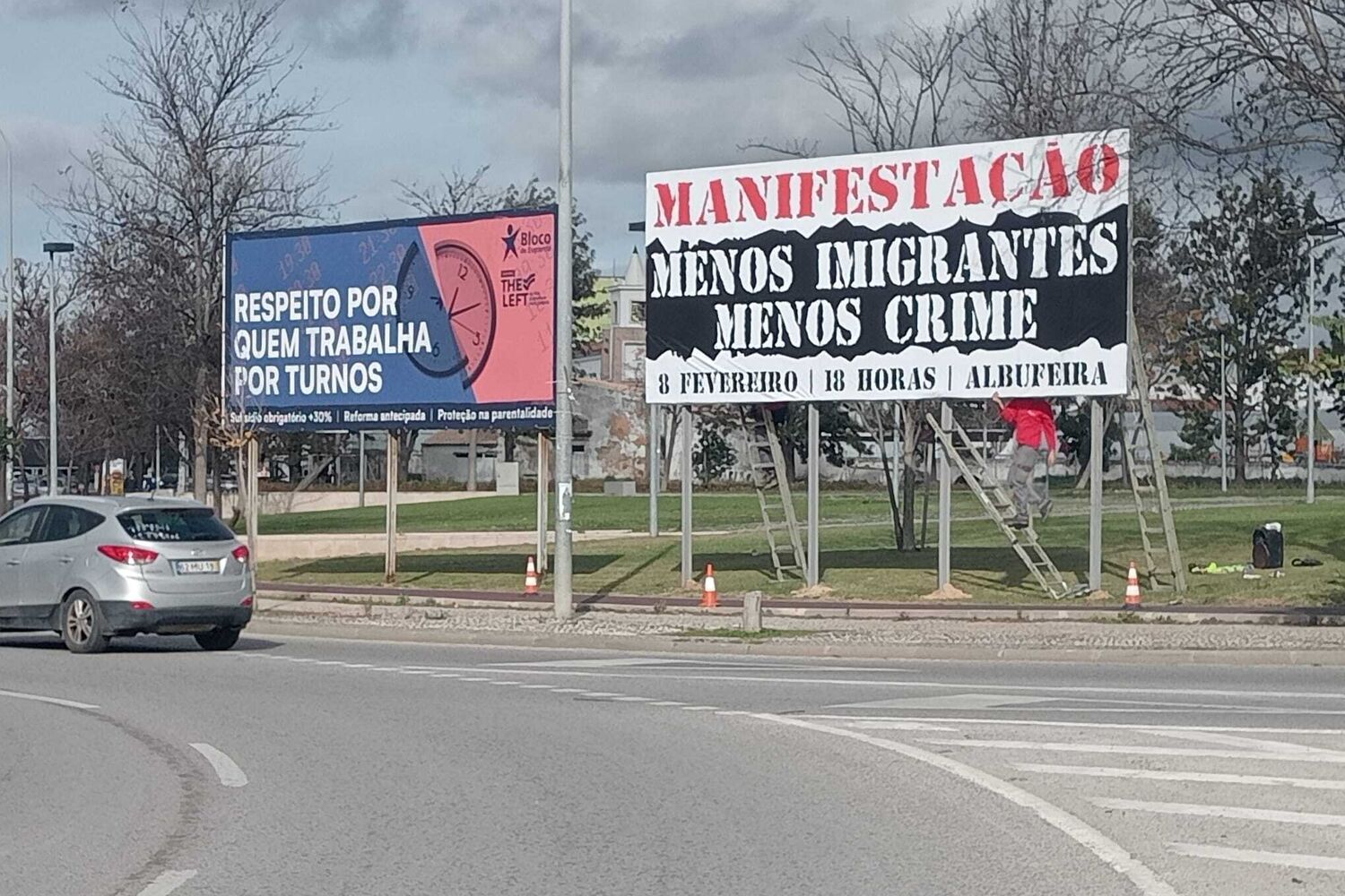 O cartaz instalado está situado ao lado de um do Bloco de Esquerda, no centro da cidade de Albufeira.