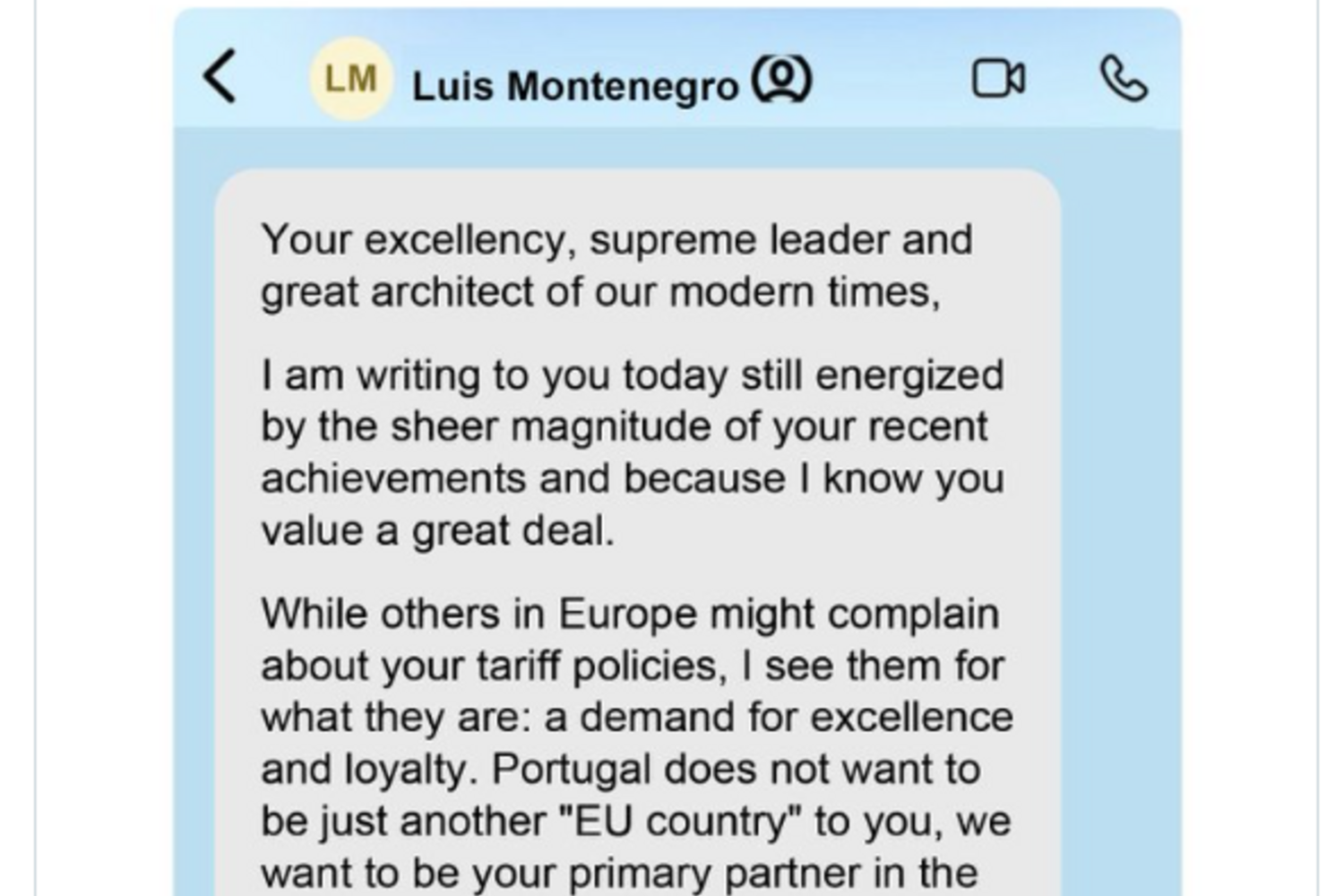"Sua excelência, líder supremo e grande arquiteto do nosso tempo moderno", lê-se na mensagem falsa. Na montagem, o utilizador conhecido pelas montagens que faz e em que o alvo são quase sempre políticos de direita, continua: "Portugal não quer ser apenas 'mais um país da União Europeia' para si, queremos ser o seu principal aliado no Atlântico". E conclui: "Para conseguirmos isso, estamos dispostos a discutir uma visão que garante a soberania americana no acesso às ilhas açorianas".