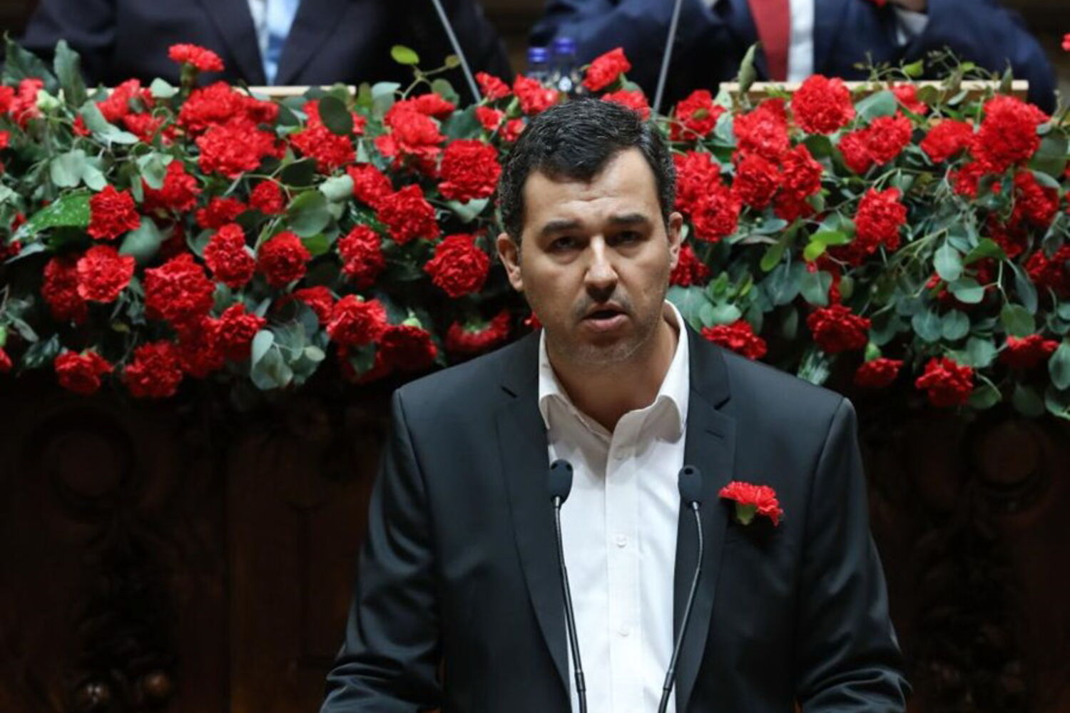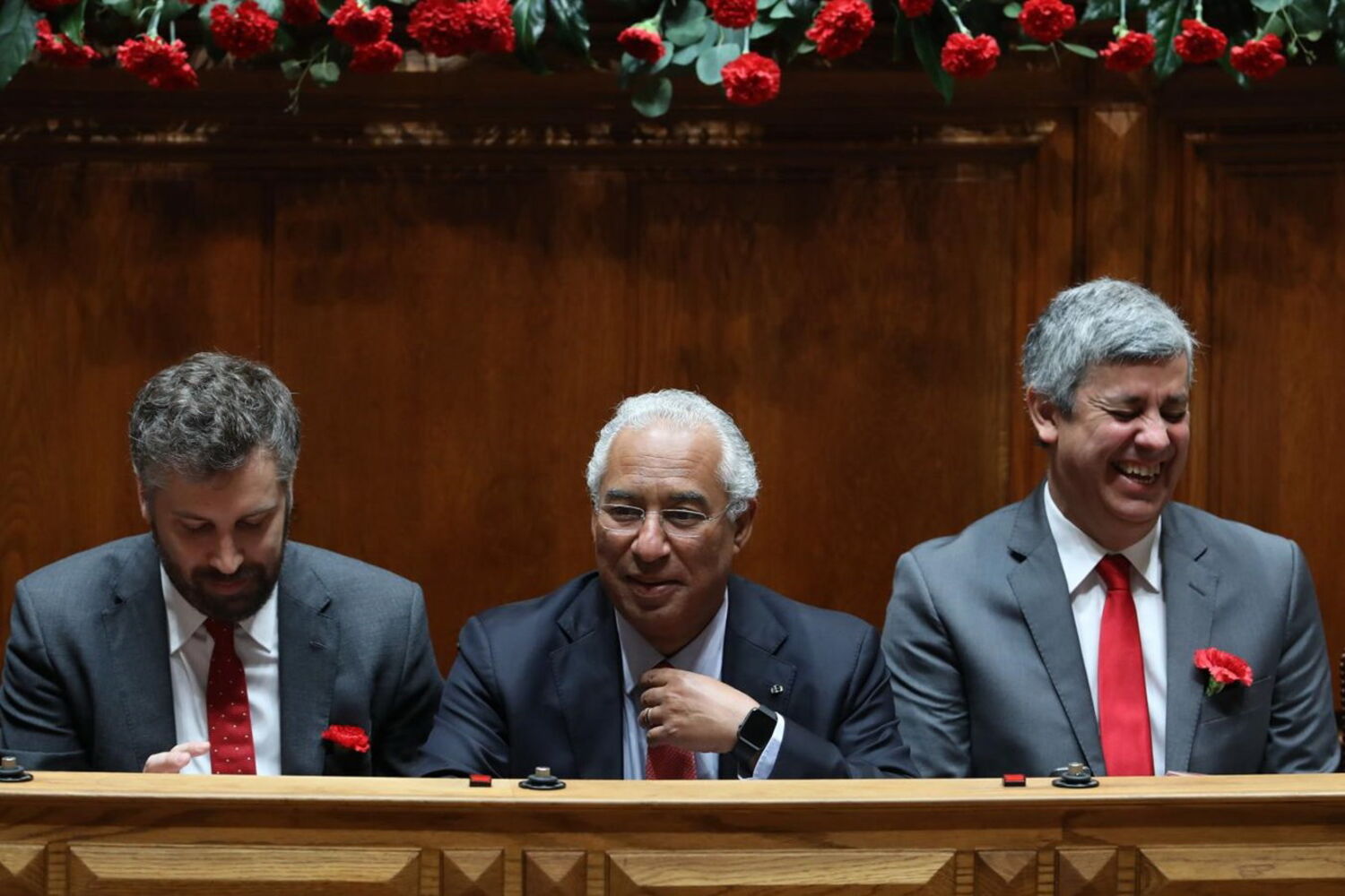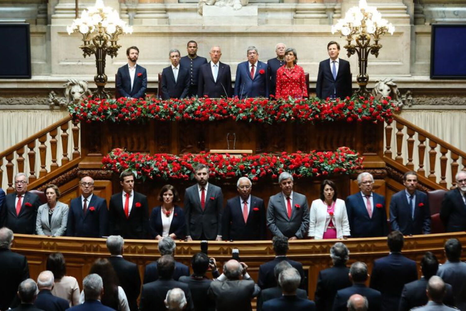 O primeiro-ministro, António Costa, e membros do Governo envergam cravo vermelho ao peito, assim como o líder do PSD, Pedro Passos Coelho.