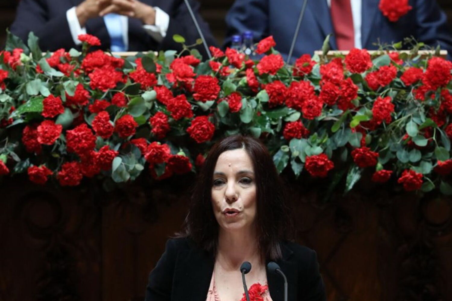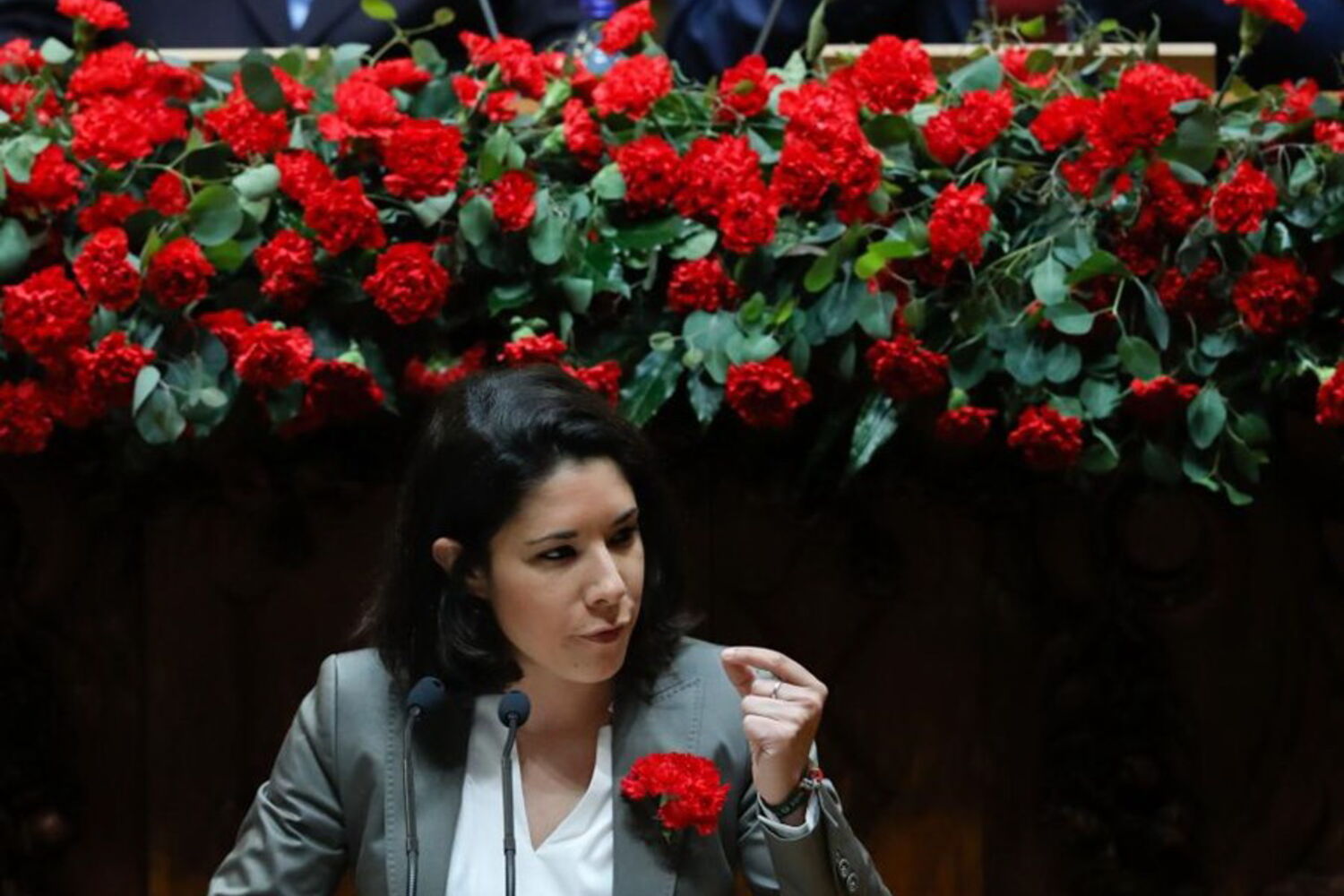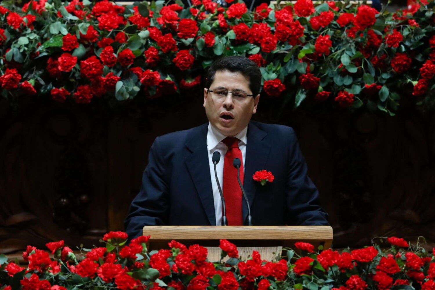 O primeiro-ministro, António Costa, e membros do Governo envergam cravo vermelho ao peito, assim como o líder do PSD, Pedro Passos Coelho.