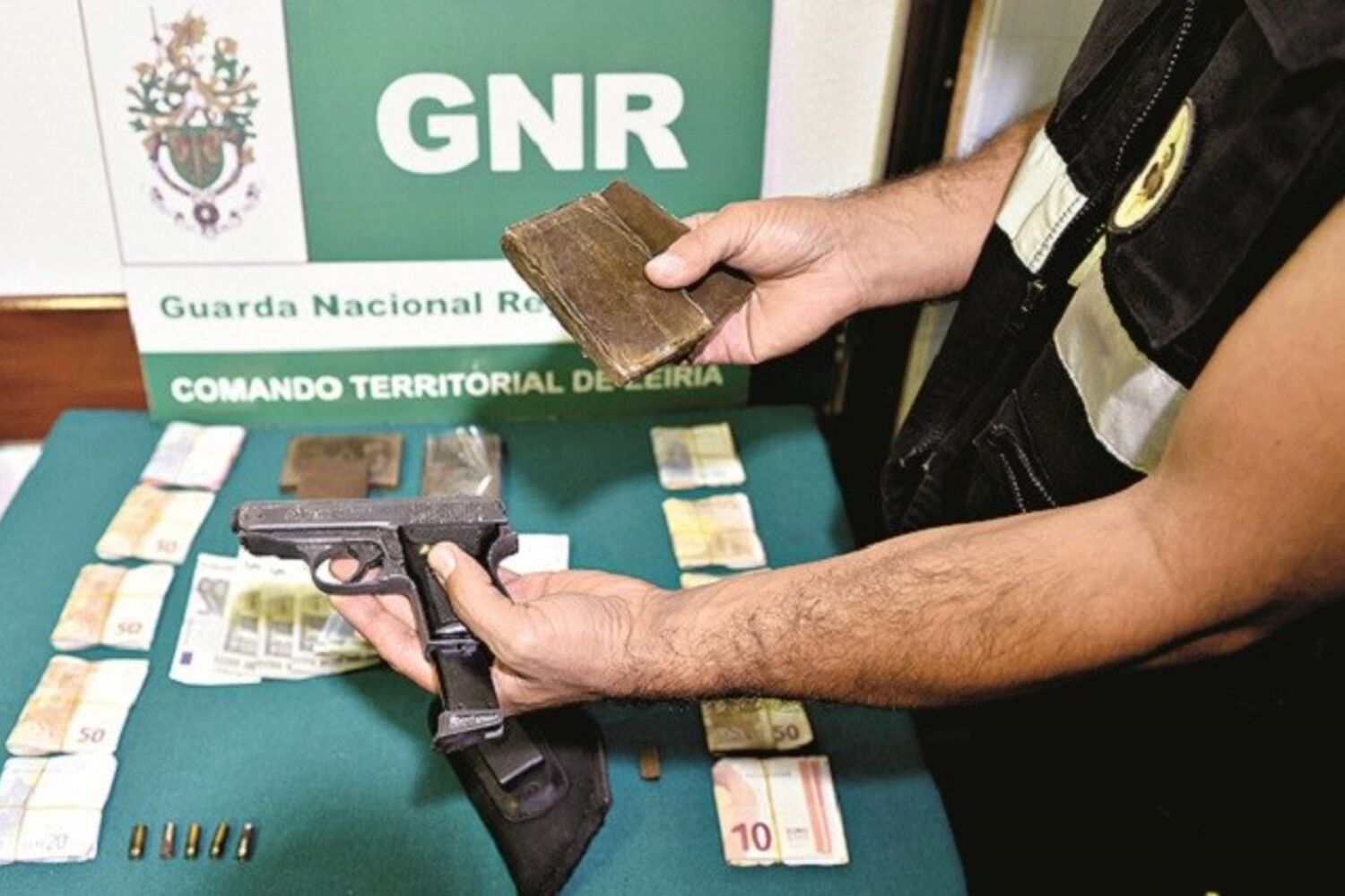 A atividade deste traficante estava a ser investigada há três meses pela GNR, que apreendeu 450 gramas de haxixe, o equivalente a 2250 doses, que estavam em poder do detido e no interior da sua residência. Nas buscas, foram também apreendidos 5110 euros, uma pistola de alarme adaptada a calibre 8 mm, com seis munições e um coldre.
