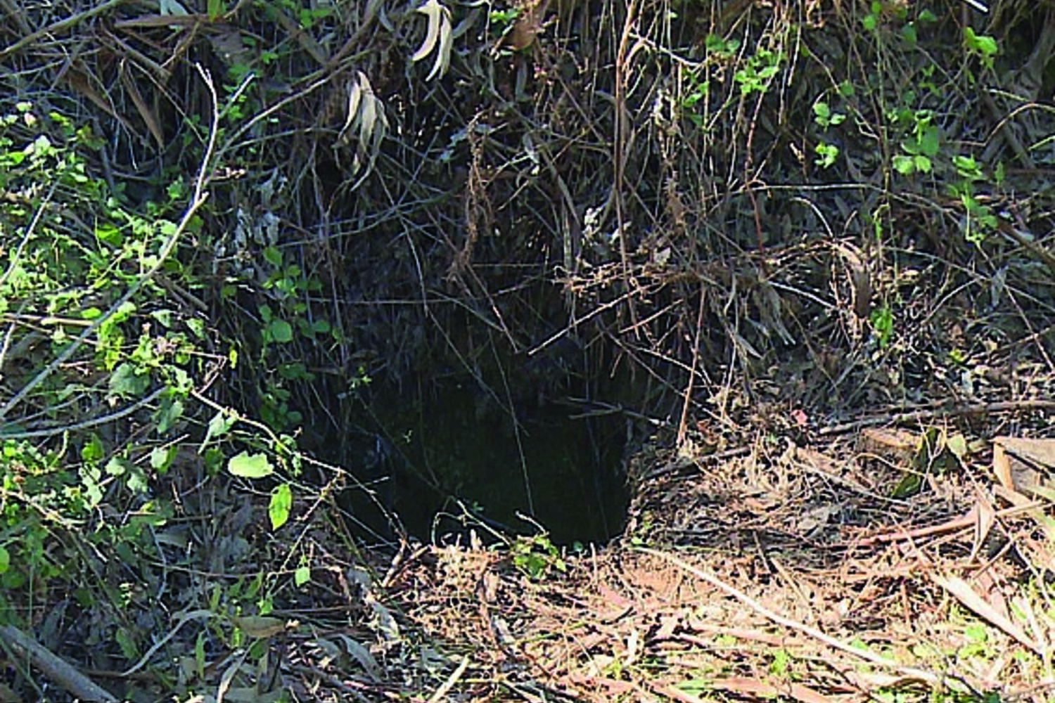 "O buraco onde ele caiu estava coberto por silvas e fetos".