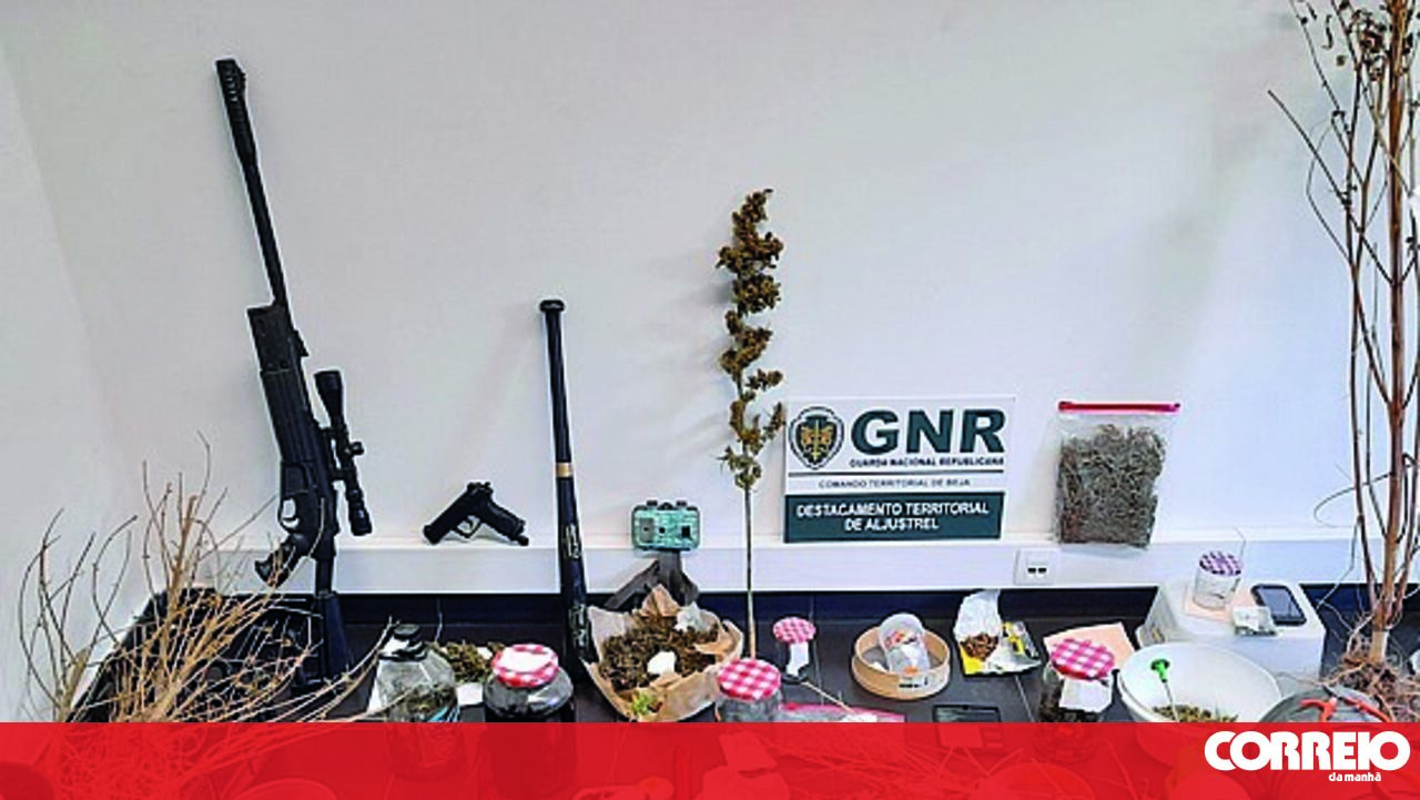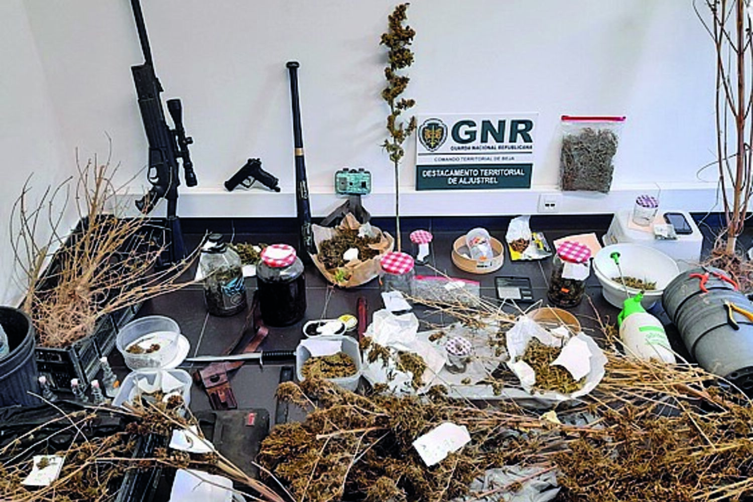 Tinha dois quilos de liamba, plantas, sementes e até óleo de canábis. Segundo revelou este sábado a força de segurança, o homem foi apanhado com várias armas - um sabre-baioneta, uma pistola de CO2 com carregador e uma espingarda de ar comprimido -, além de munições e uma mira telescópica.