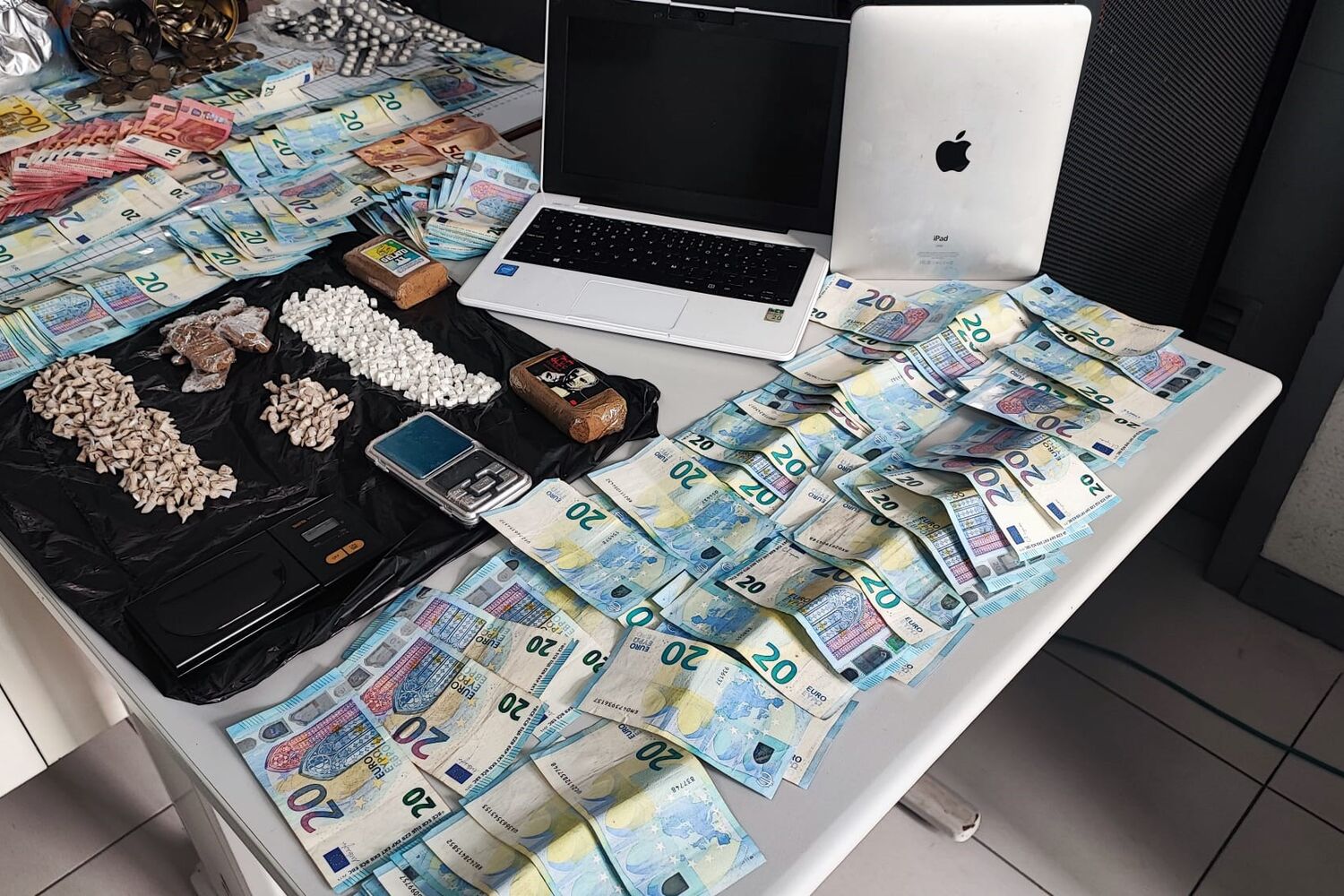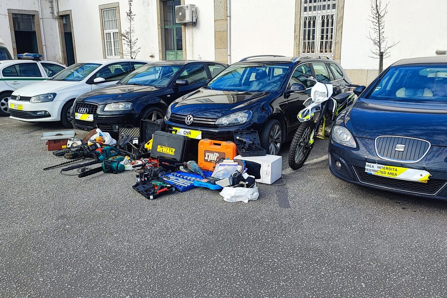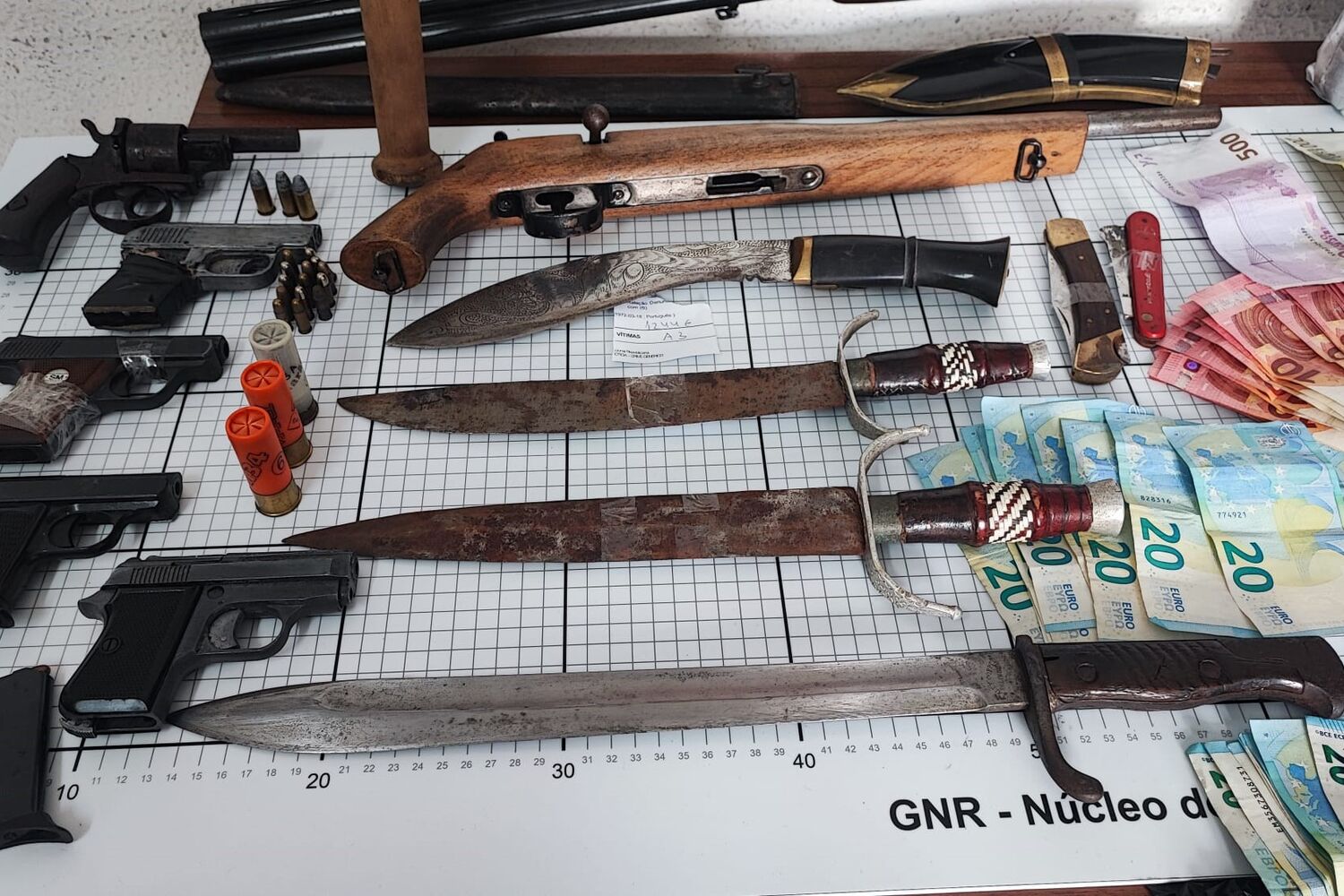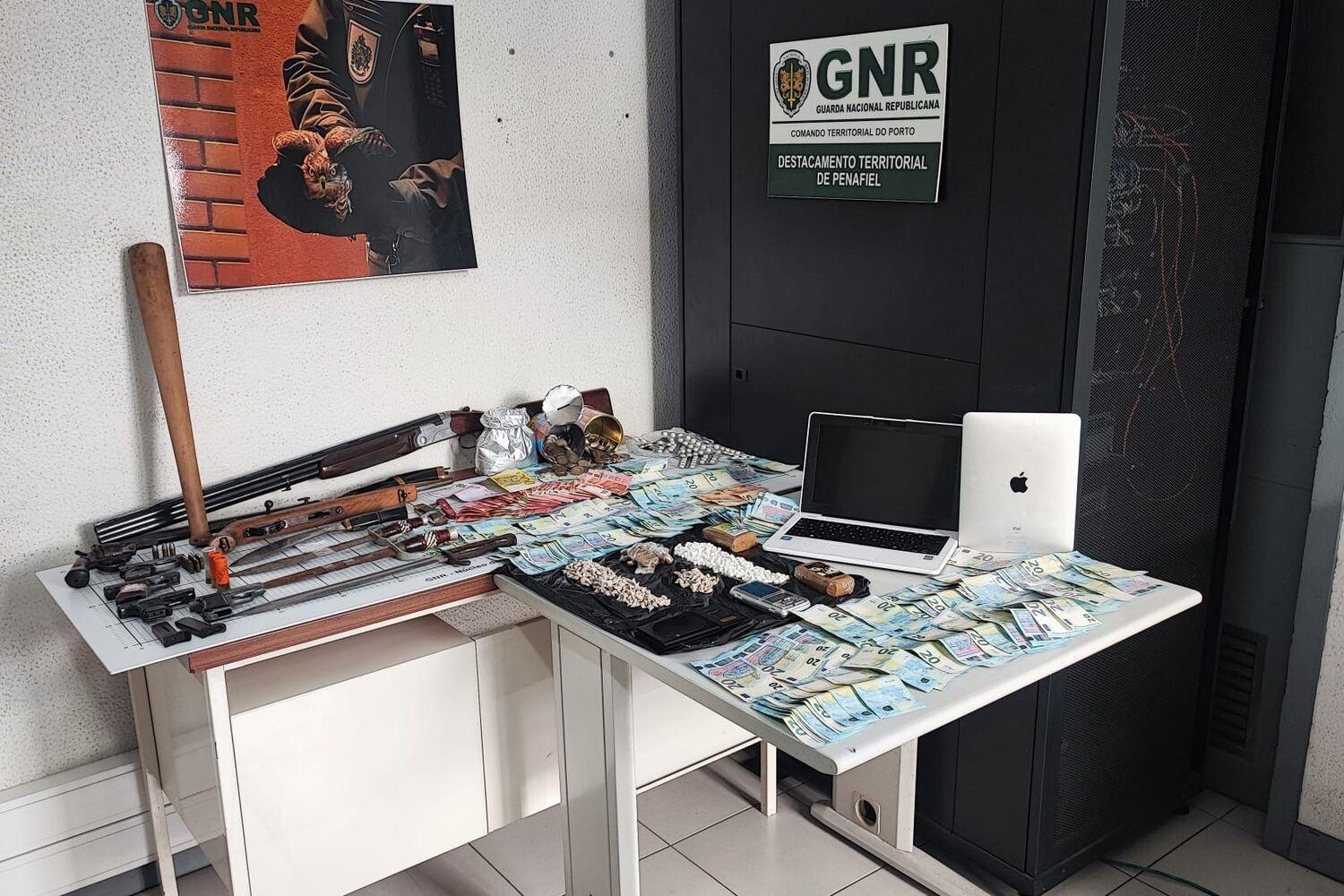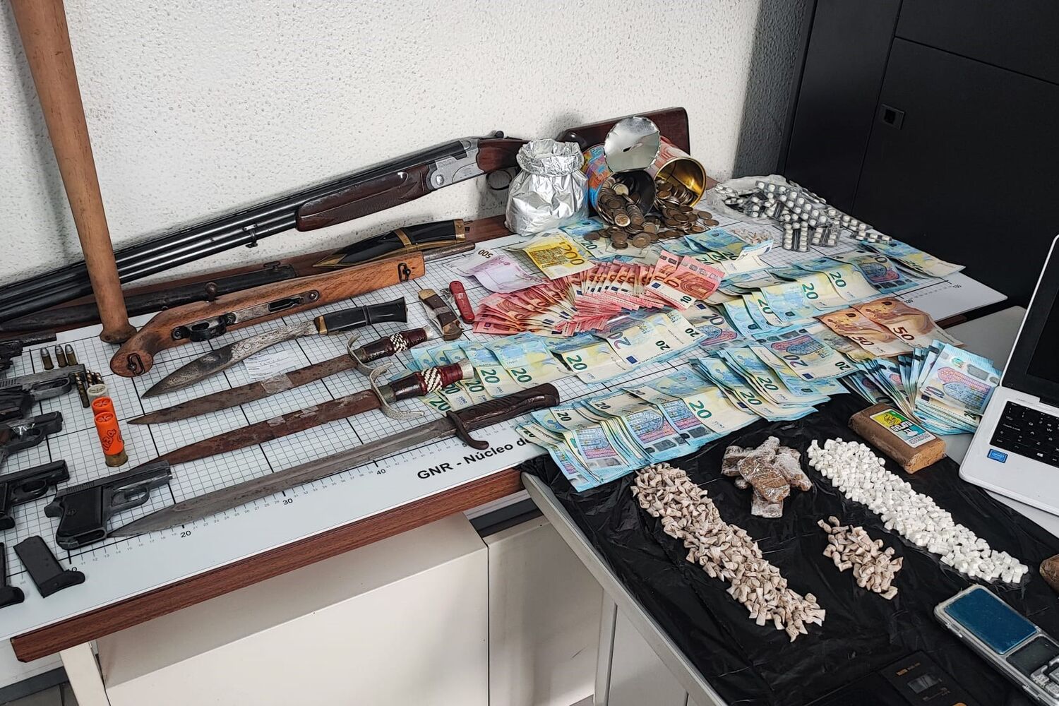 Segundo comunicado da GNR, os militares apreenderam mais de sete mil euros em numerário, 618 doses de heroína, 294 doses de cocaína, 436 doses de haxixe, 165 comprimidos de metadona, sete armas de fogo, três sabres, um punhal, seis viaturas, um computador portátil, 21 telemóveis, um iPad, uma balança de precisão, várias máquinas, ferramentas e instrumentos de bricolage e construção, provenientes de furtos e ainda diverso material relacionado com o tráfico de estupefacientes.