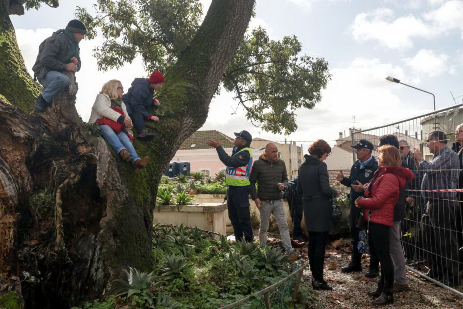 Os manifestantes - Otília Santos, Ana Madureira e Pedro Carvalho - subiram à árvore pouco depois das 08:00 desta quarta-feira mas saíram por sua própria vontade, cerca das 18:00, uma hora após a PSP ter reforçado a segurança no local, proibindo o acesso à zona em redor da árvore, o que não aconteceu ao longo do dia.
