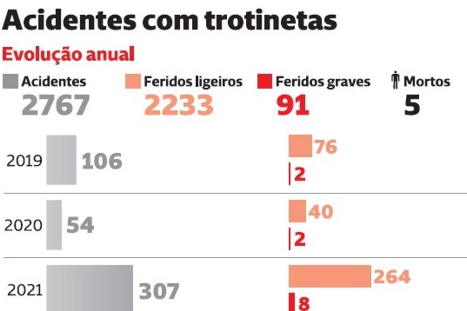 São pequenas, ágeis, relativamente baratas e tornaram-se uma presença incontornável nas ruas das principais cidades. Mas também são frágeis e responsáveis pela ida de centenas de pessoas - sobretudo jovens - às urgências devido a ferimentos graves todos os anos e pelo menos cinco mortes desde 2023. As trotinetas já são responsáveis por mais de 500 acidentes graves todos os anos (ver infografia).