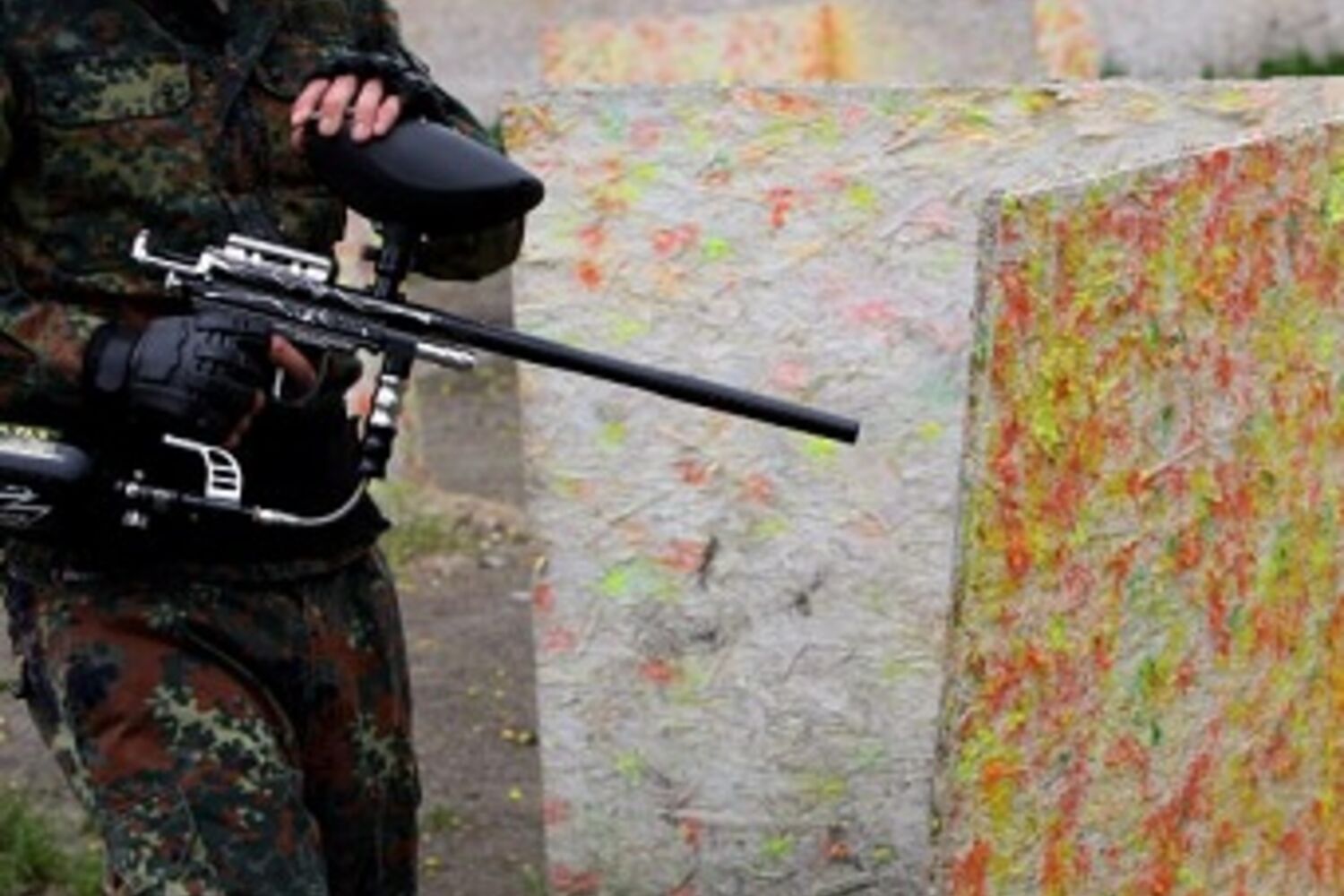Os jogadores estão equipados com máscaras e coletes de proteção e usam armas de ar comprimido que servem para atirar as bolas a grande velocidade que, ao atingirem o adversário, rebentam e libertam a tinta.