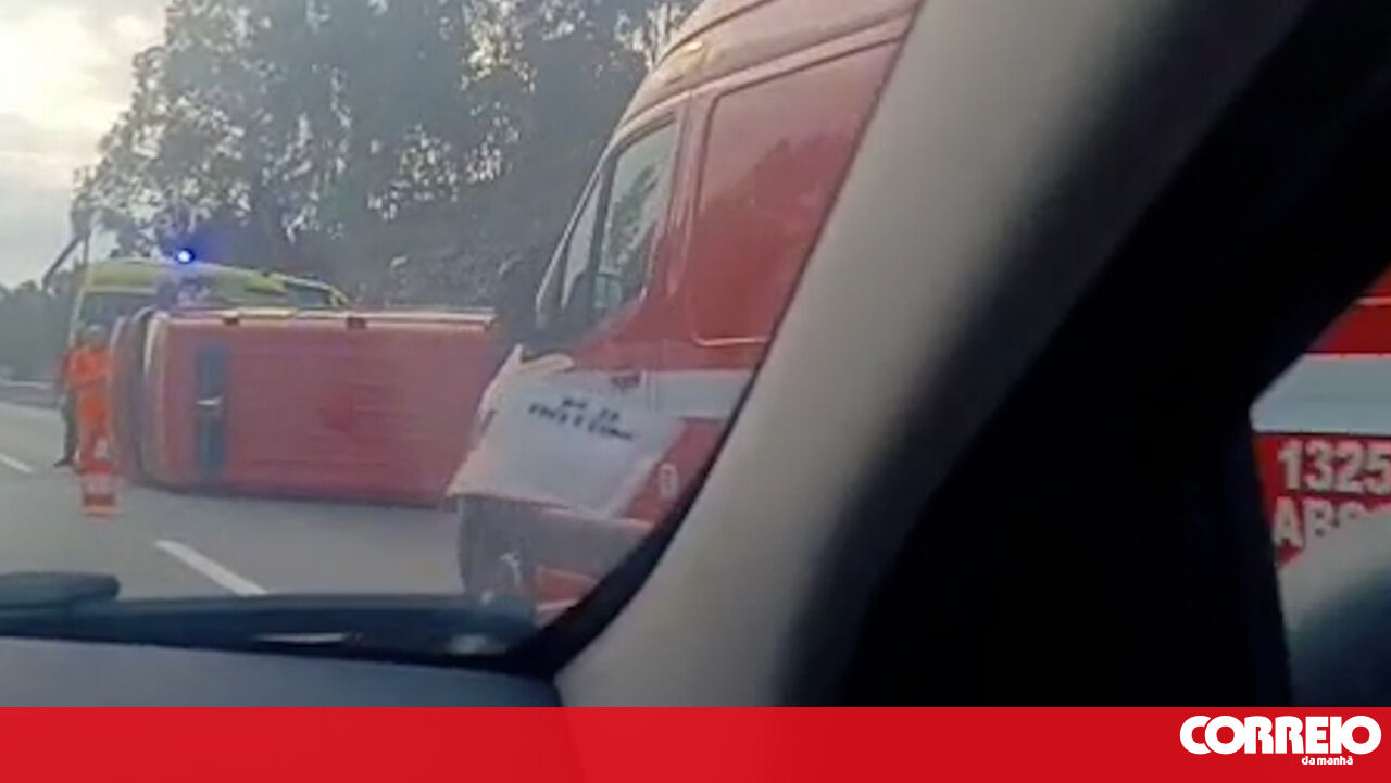 O veículo de transporte de doentes não urgente tombou na estrada e ficou imobilizado na via direita da autoestrada. A ambulância e a maca ainda estão no local.
